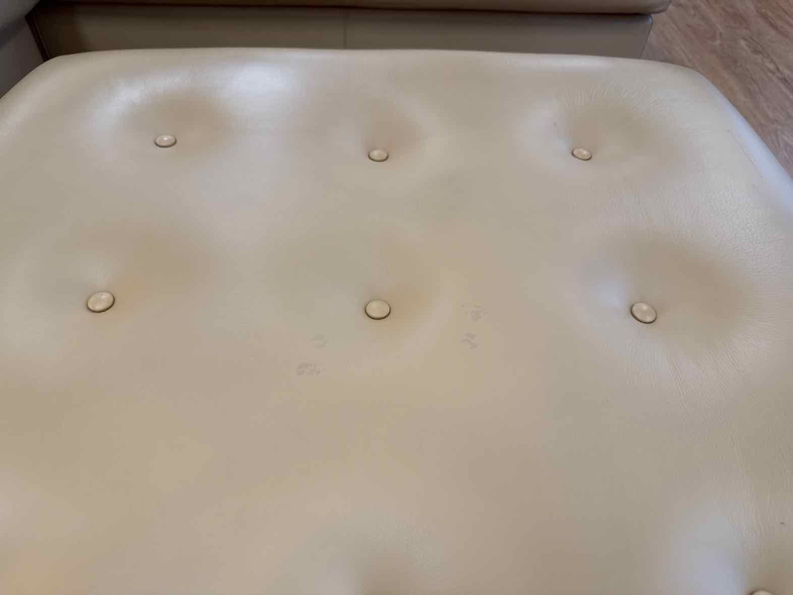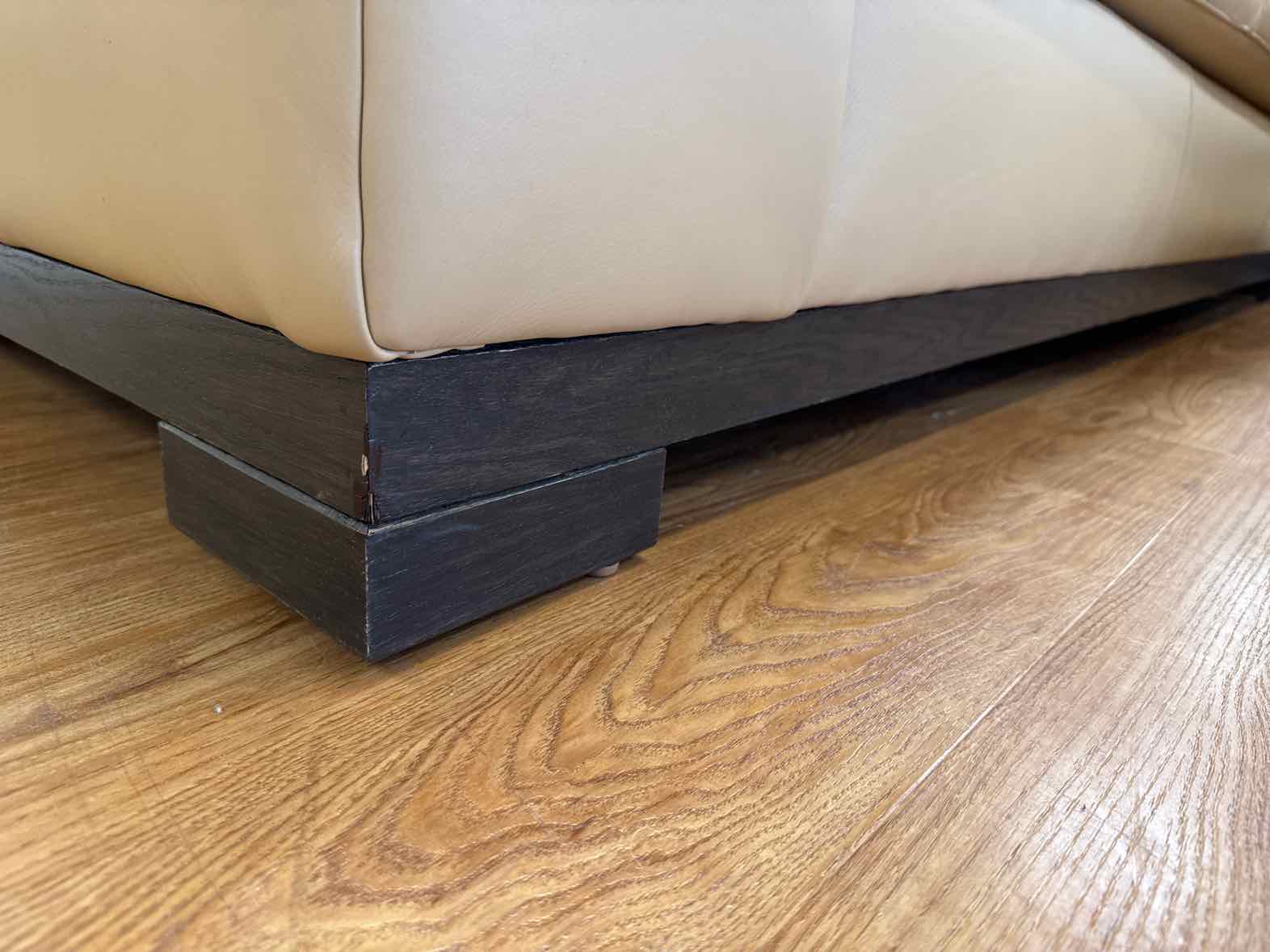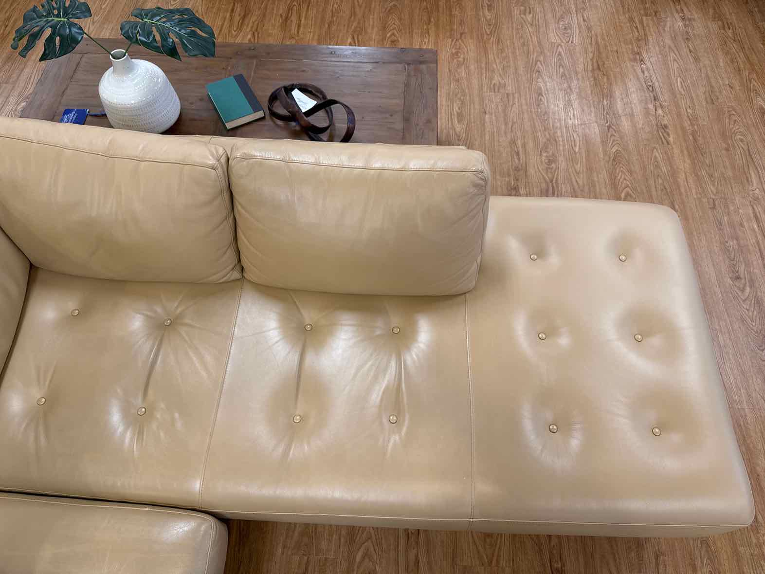 Butterscotch leather right-arm-facing sectional with tufted bench seats and walnut base, matching ottoman