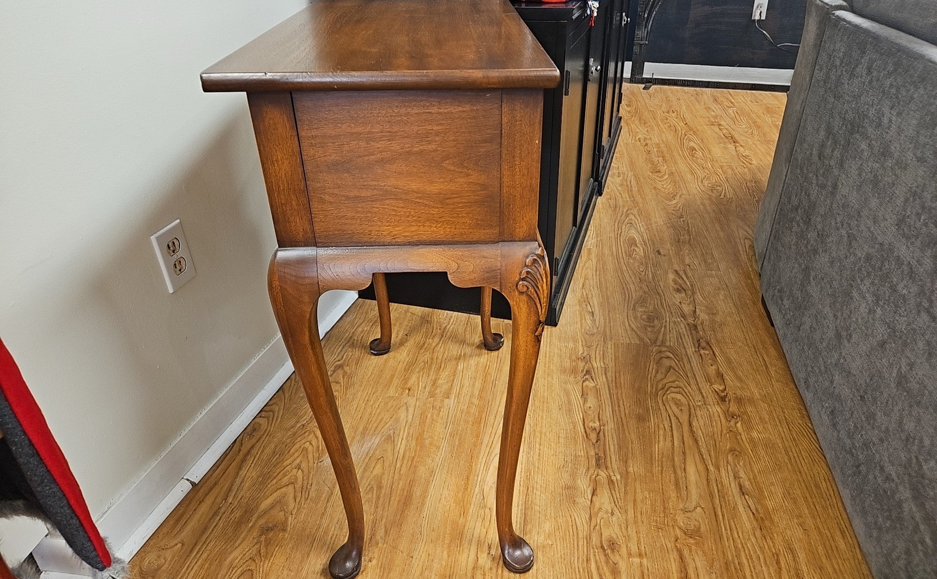Cherry colonial-style accent table with drawer, brass pull and bowed legs