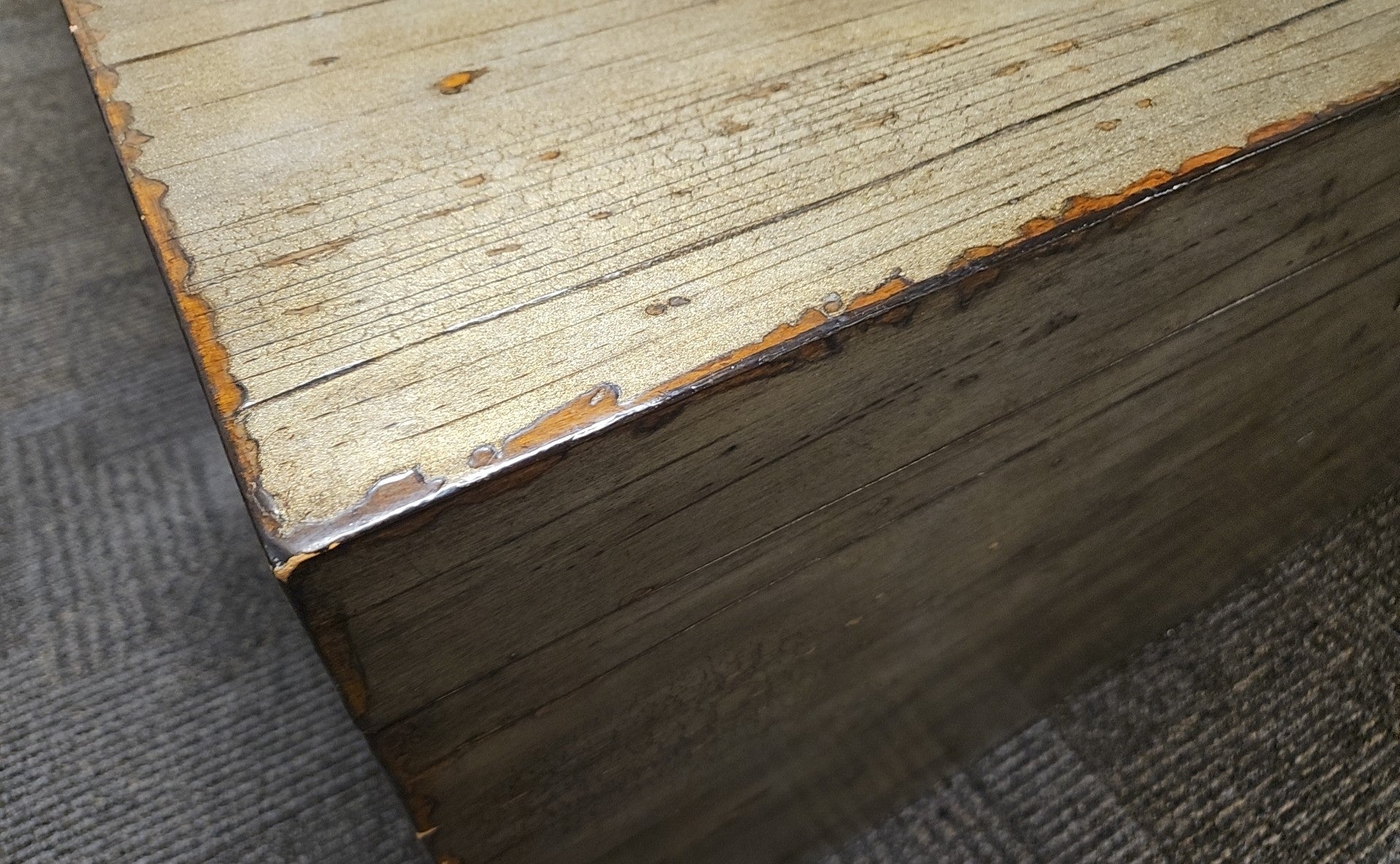 Distressed storage trunk with champagne finish, magnetic closure (hardware is loose)