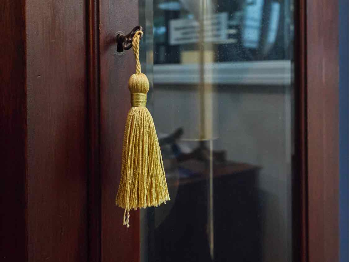 Antique Grandfather clock with sea motif, brasswork face and mahogany case with pediment and finials
