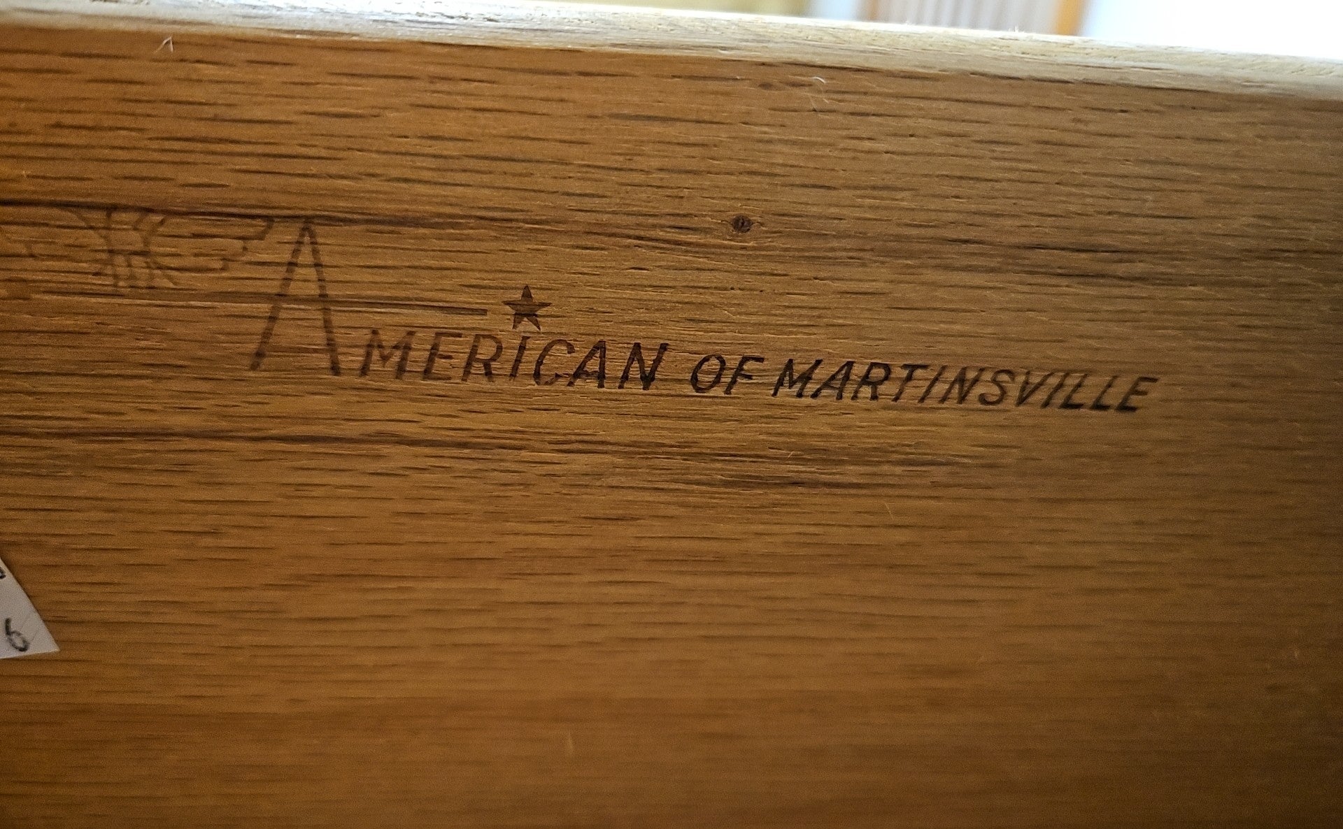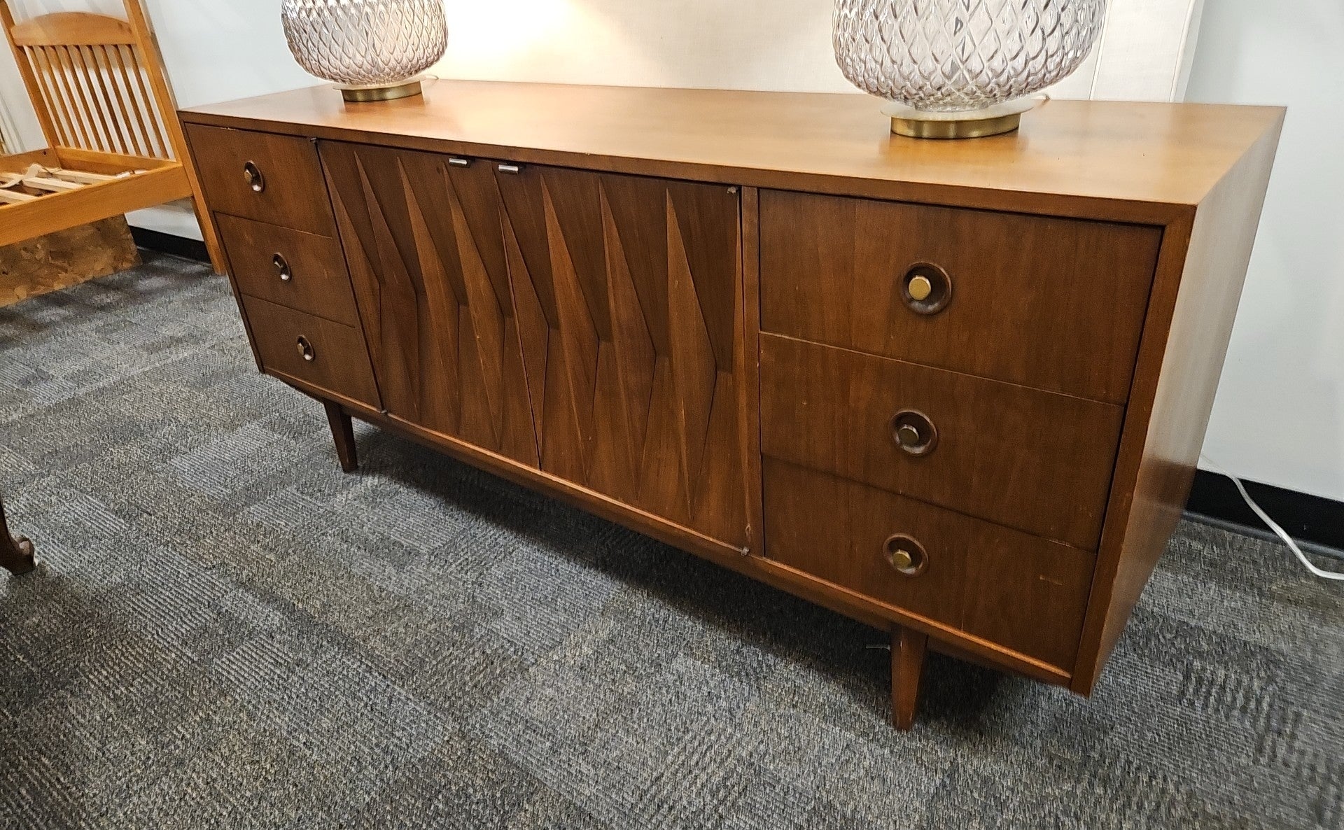 MCM 9-drawer dresser, sculpted diamond front doors, tapered leg and antique brass pulls - by Albert Parvin