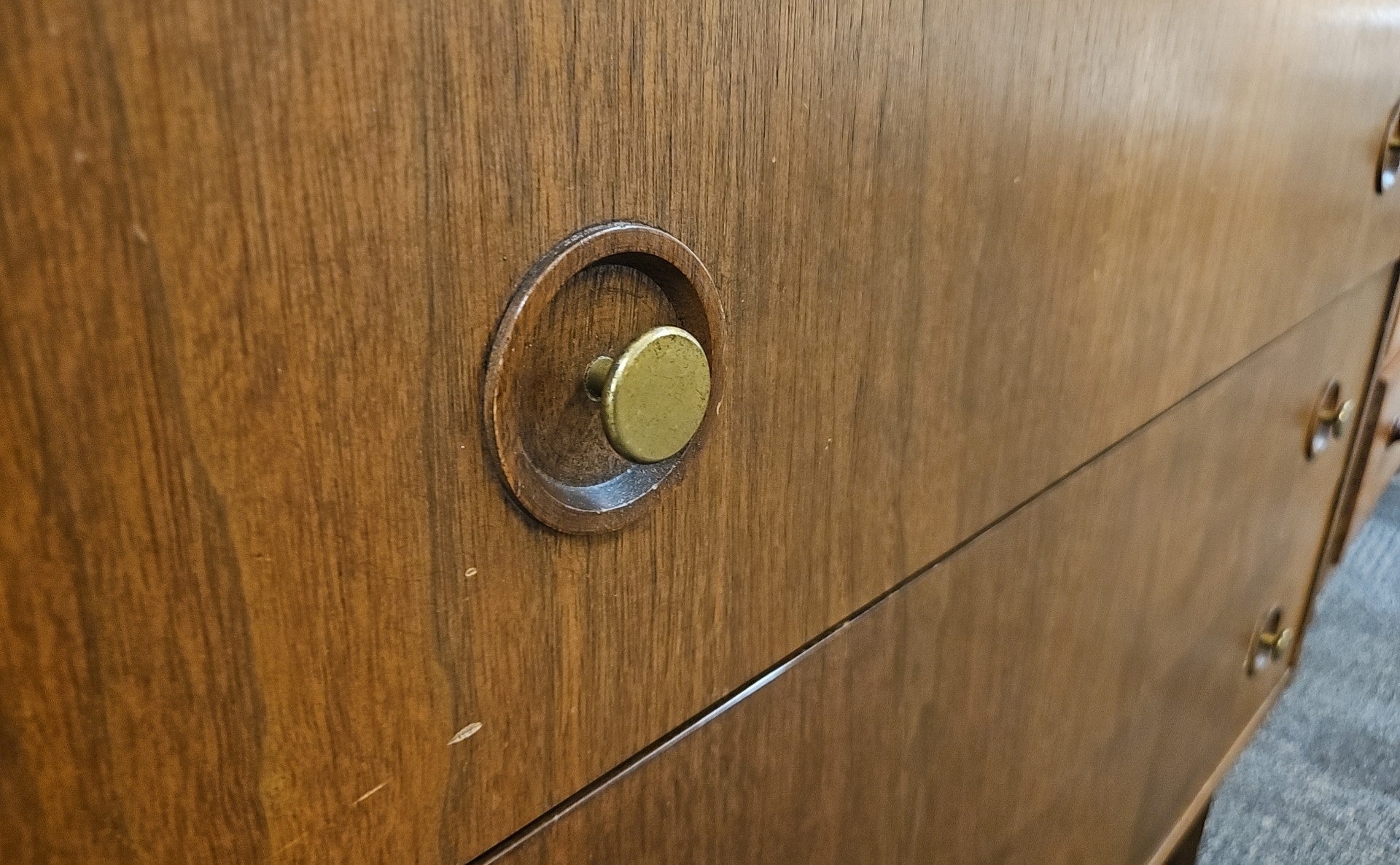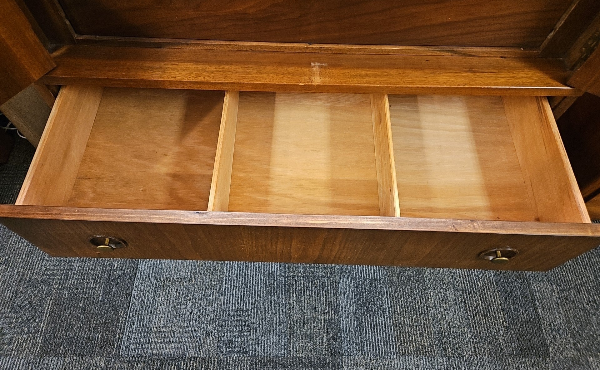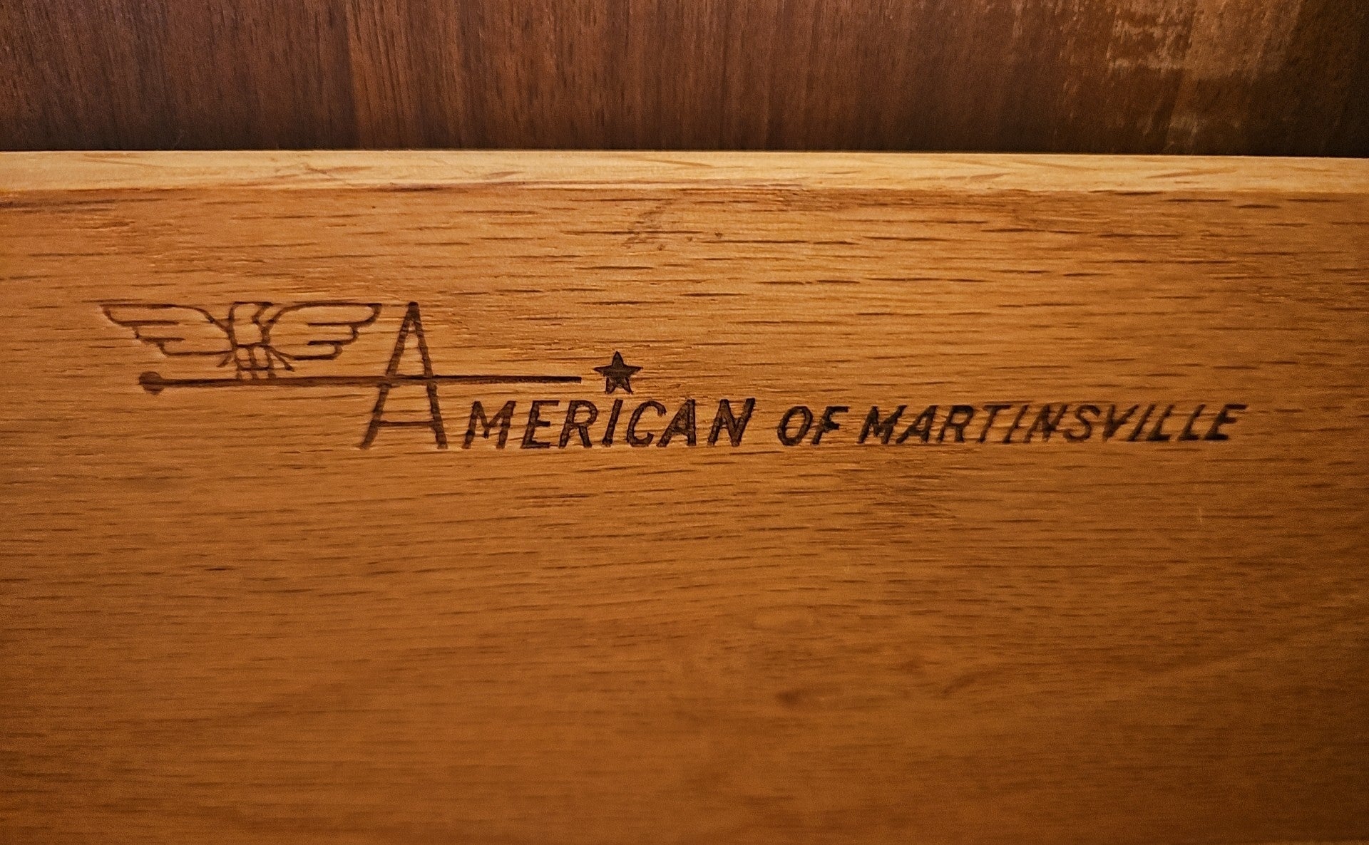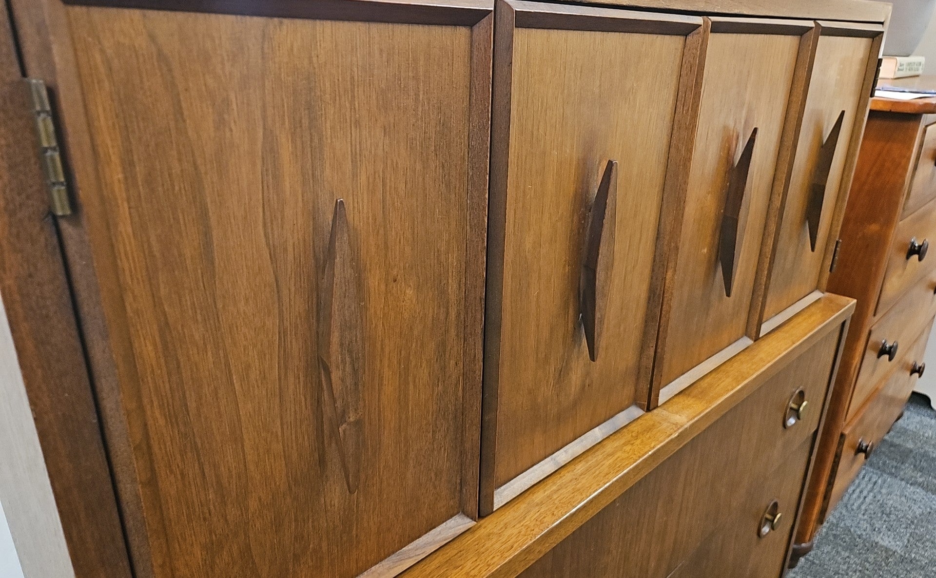 5-Drawer highboy, sculpted diamond front doors, tapered legs and antique brass pulls - by Albert Parvin