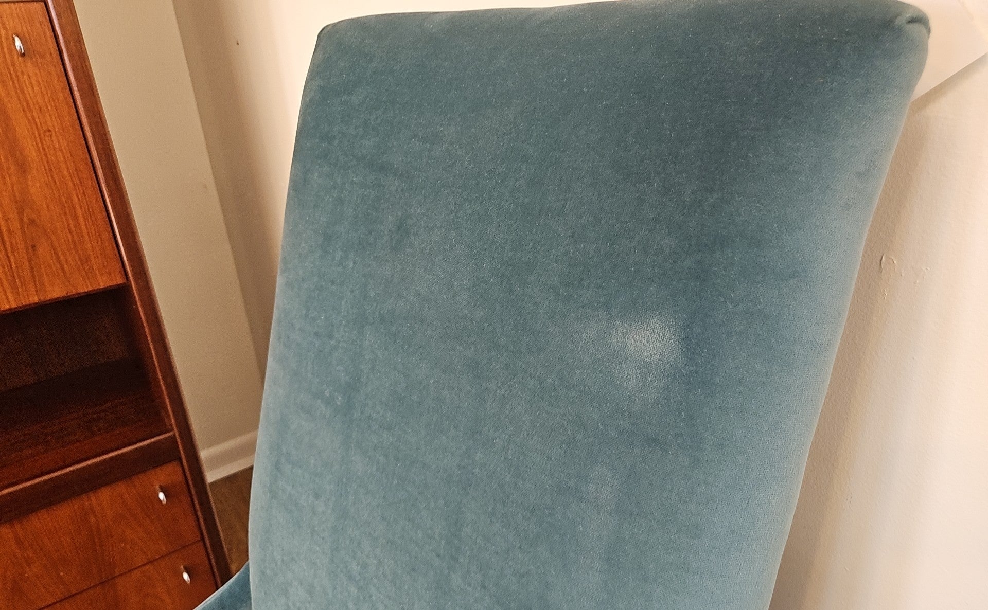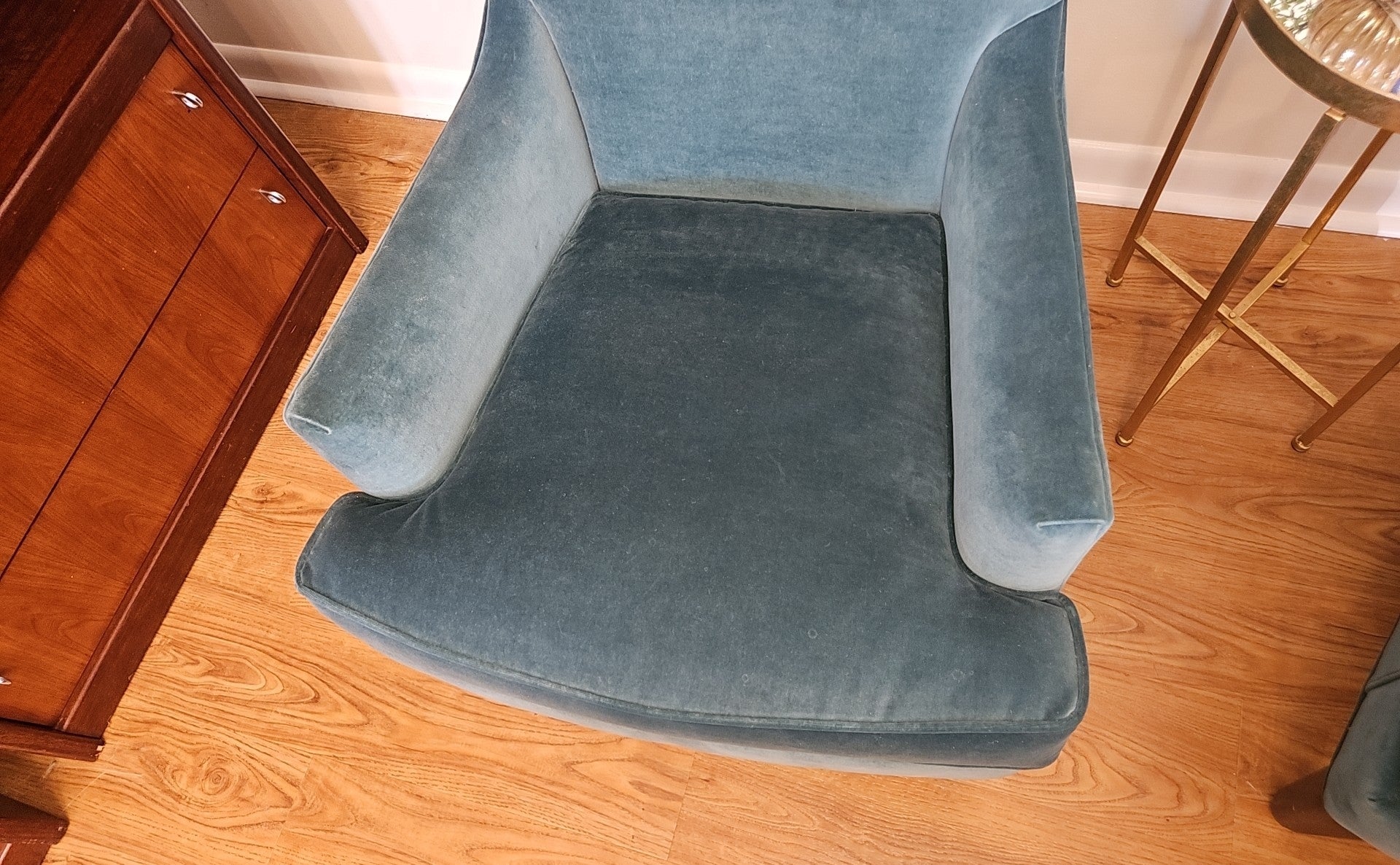 Pair of teal velvet tall highback chairs with espresso feet, set includes matching lumbar pillows