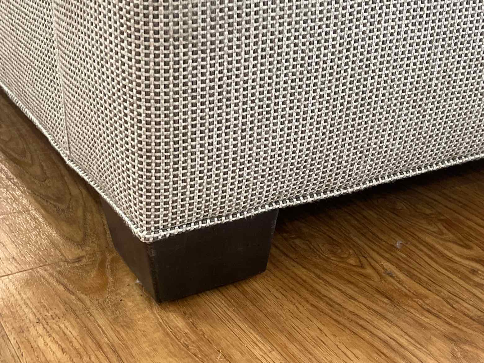 2-seat taupe and light brown check upholstered sofa with sock arm and espresso feet, includes 2 throw pillows