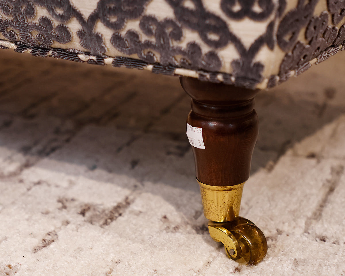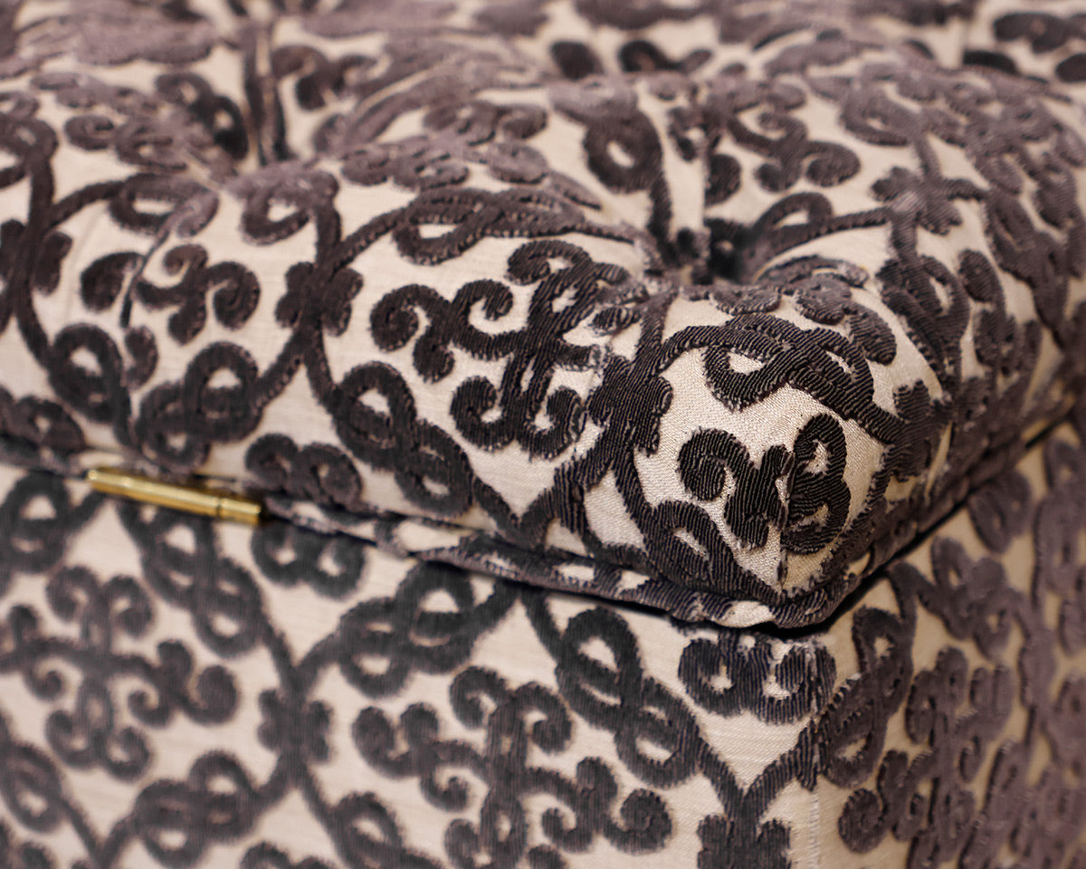 Rectangular storage ottoman on spindel wood casters w/ diamond tufted top cut velvet scroll pattern