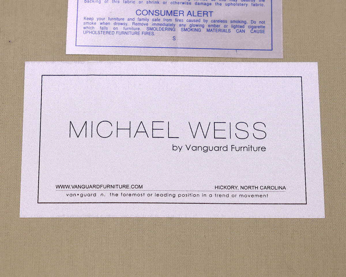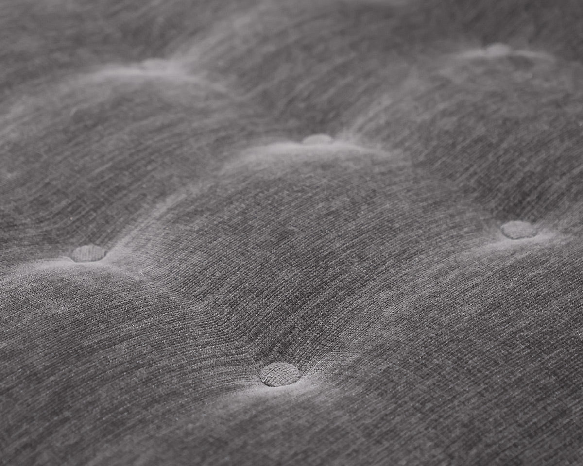 Vanguard daybed in a charcoal gray colored woven fabric with cream colored welting. Button tufted on top with a dark walnut base on tapered legs.