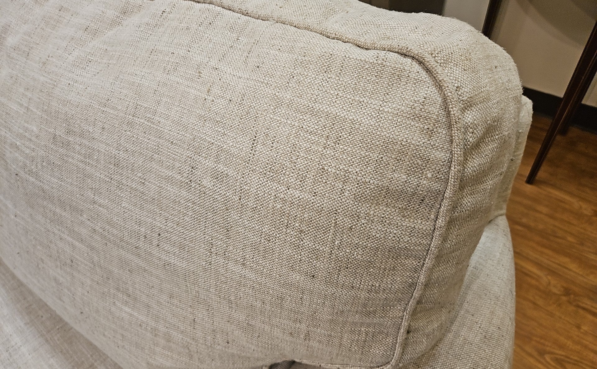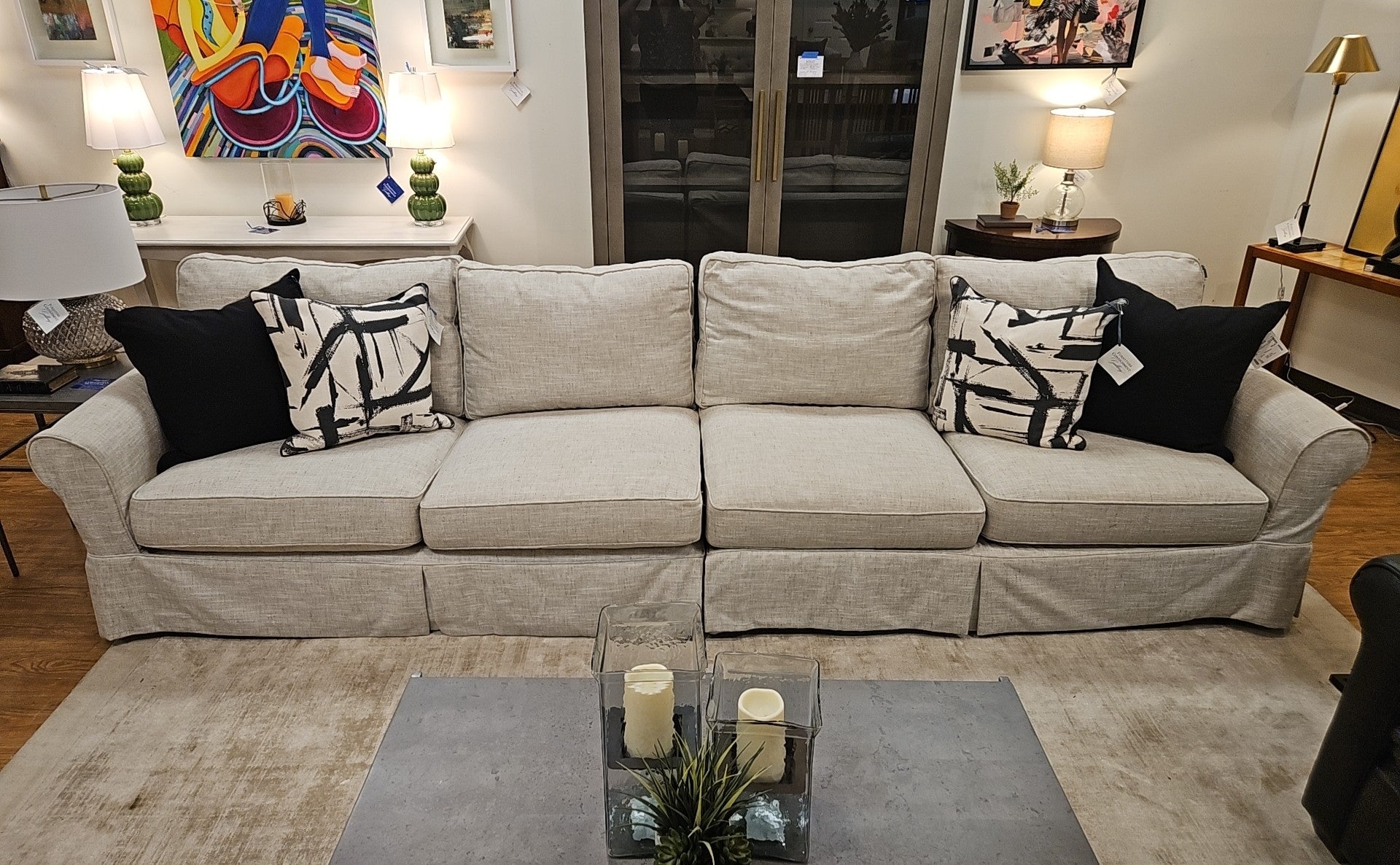 Custom made 4-seat sofa in 2 pieces, dappled grey fabric, frame has slip cover, sock arm