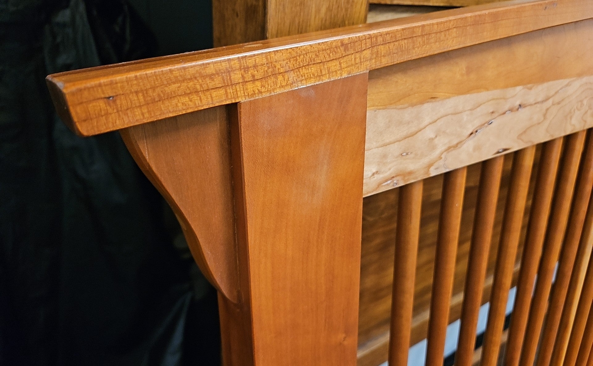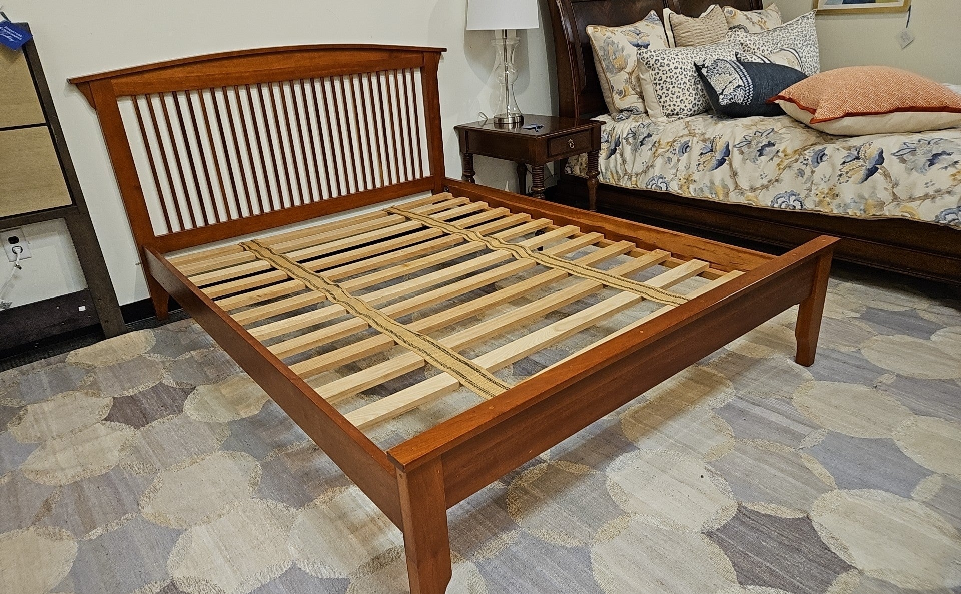 Cherry mission style queen bed with arched spindle headboard, footboard is 18"h (hb, fb, sides, slats)