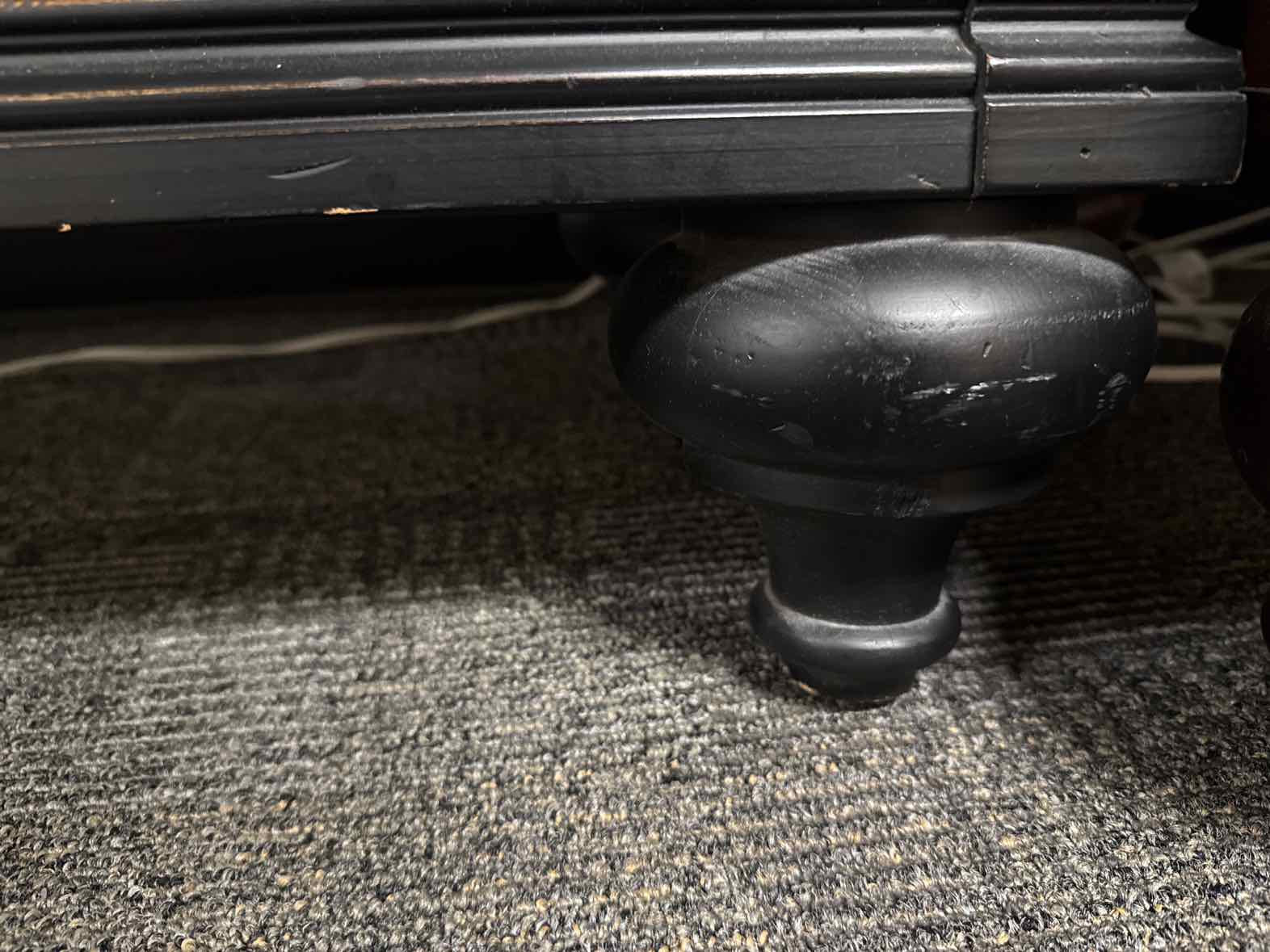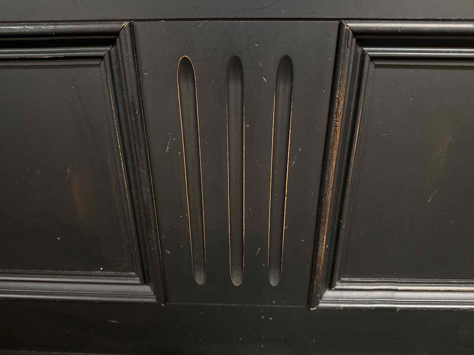 King sleigh bed in black distressed finish (headboard, footboard, rails, 4 wooden supports)