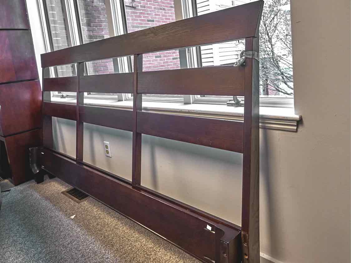 King bed with horizontal slat headboard and low-profile footboard in espresso finish oak, with rails & center supports