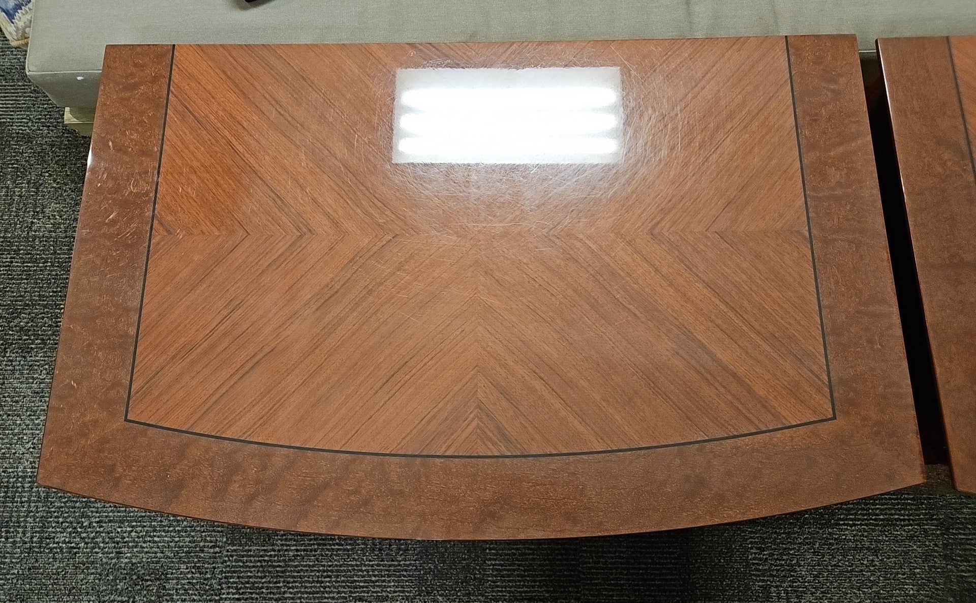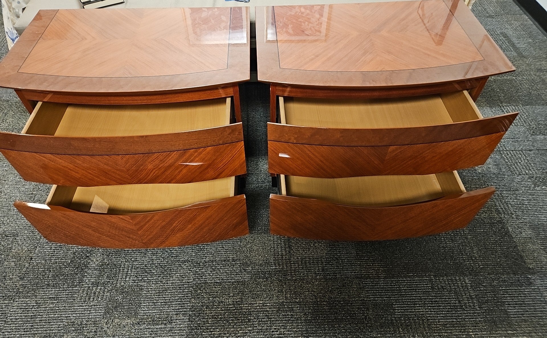 Italian-made high gloss lacquer pair of 2-drawer nightstands with dual tone wood and inlay