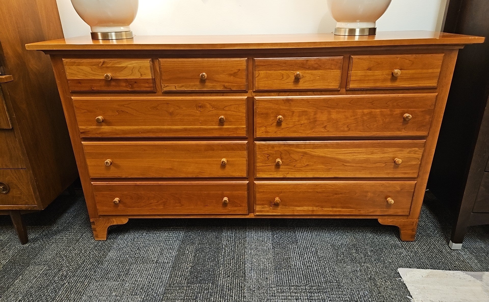 Natural cherry 10-drawer dresser with dovetailed drawers and dovetail jointed foot