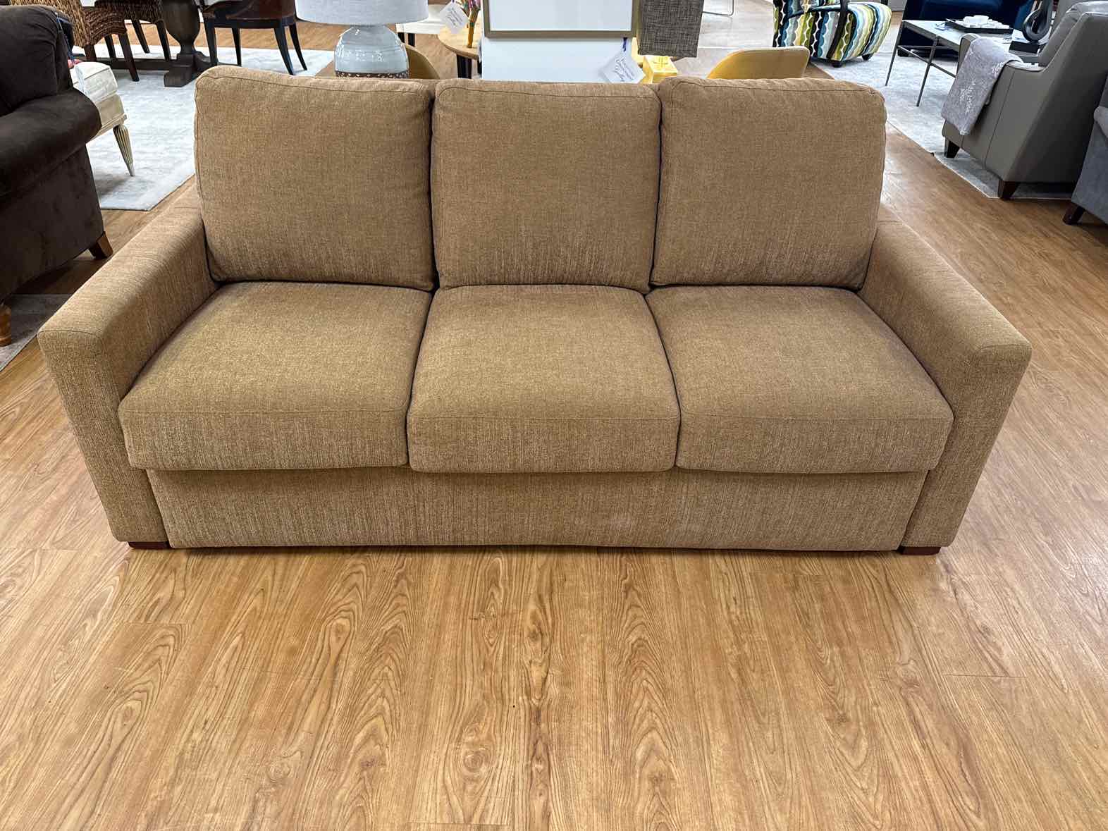'Berin' queen size 3-seat sleeper sofa in antique gold fabric with 6" track arm and oak foot