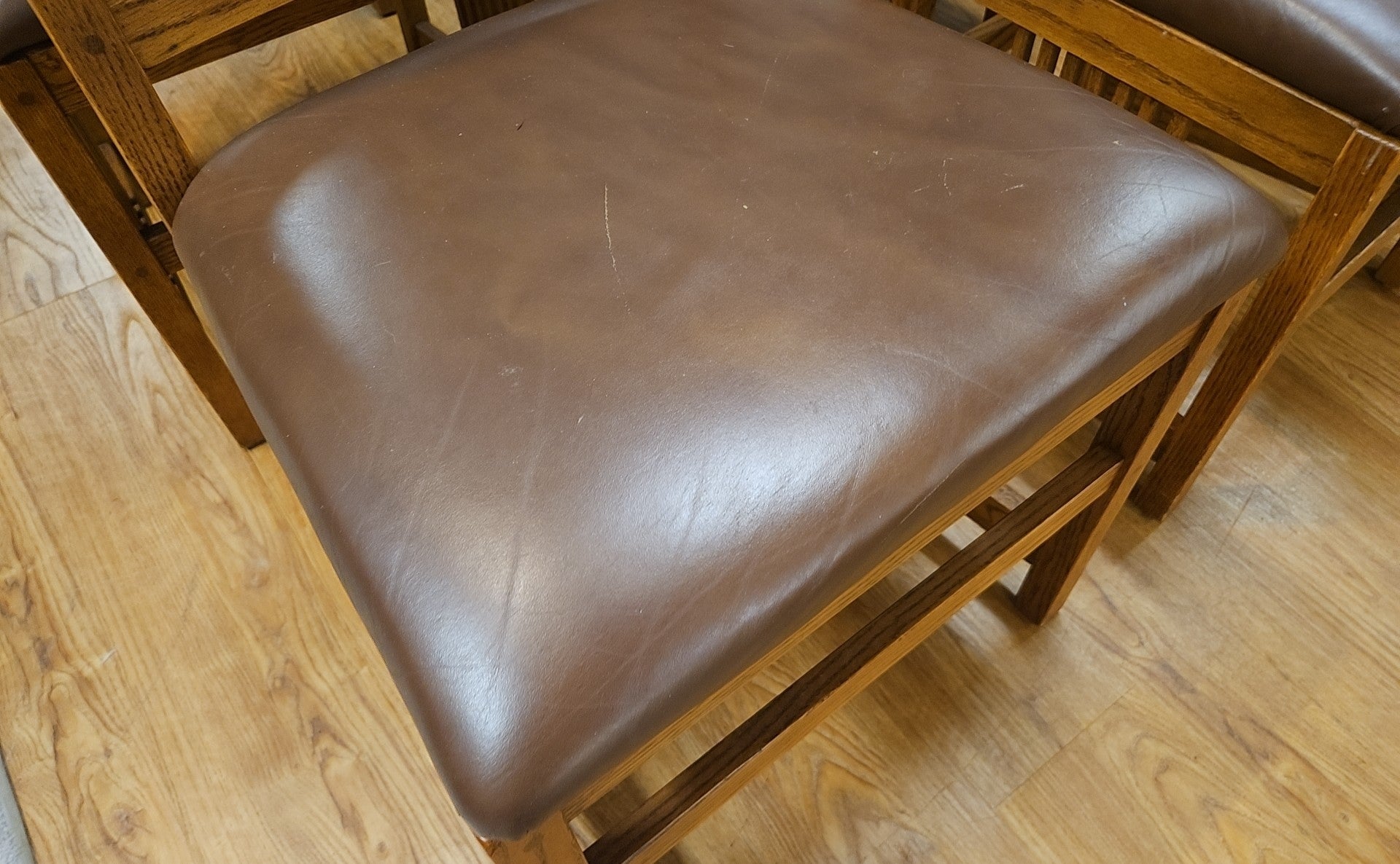 Mission style dining set with 8 chairs (6 side and 2 host), cocoa leather seat, includes 2 15"w leaves