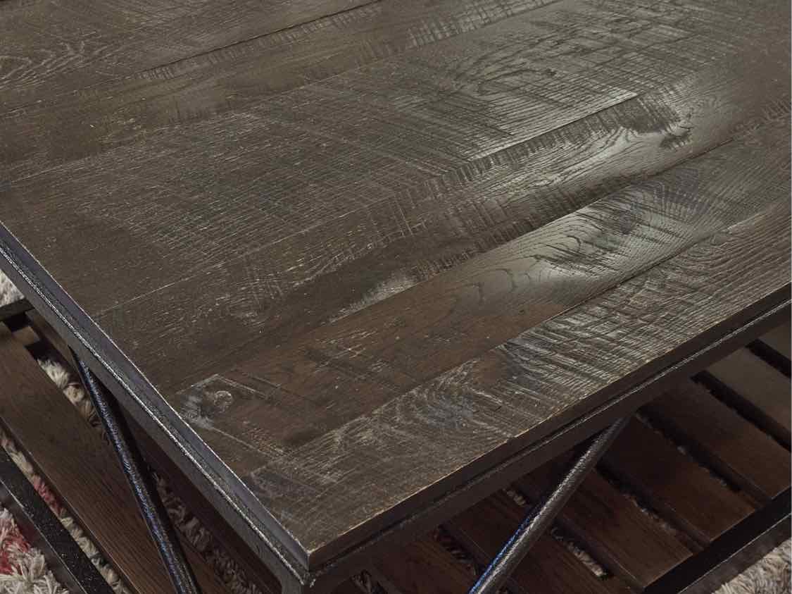"Casual Traditions" cocktail table with black rustic top on metal frame with lower shelf