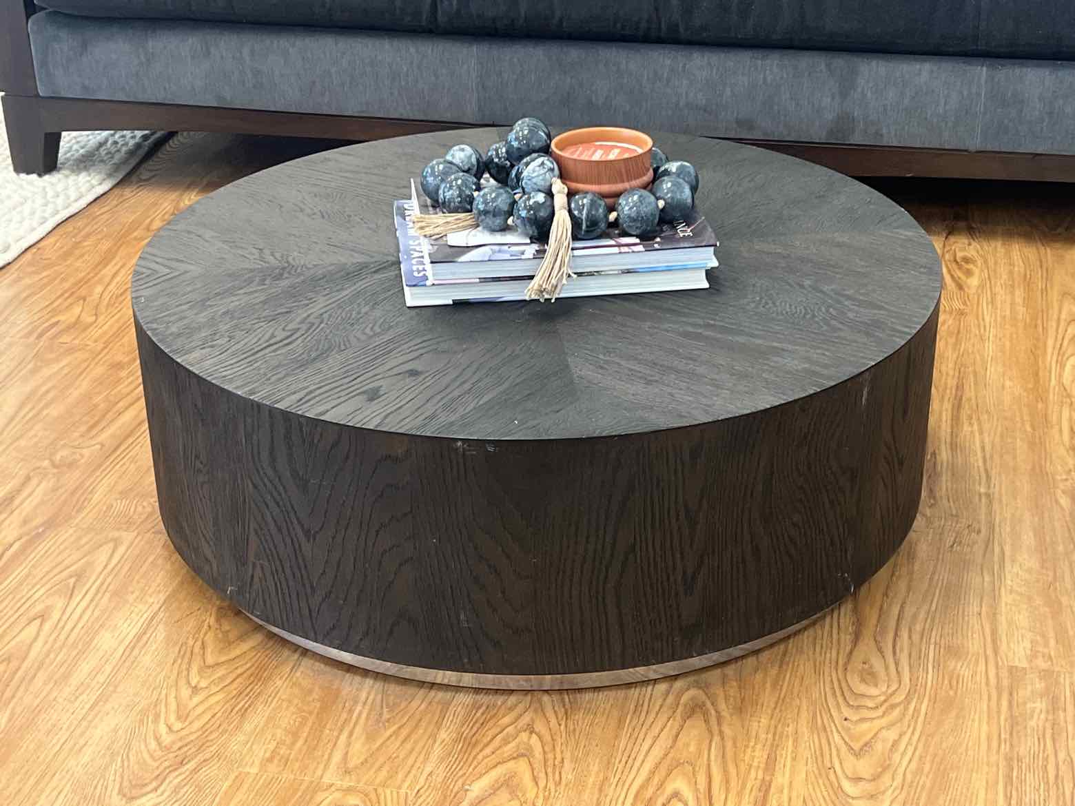 Restoration Hardware 'Machinto' espresso cocktail table w/ polished metal base