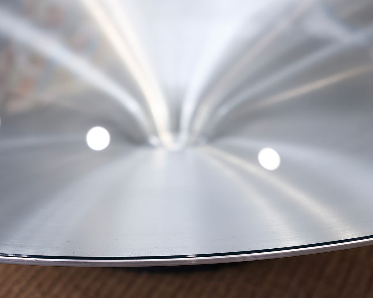 "Ovni Up" large cocktail table. round aluminum and glass table on pedestal base