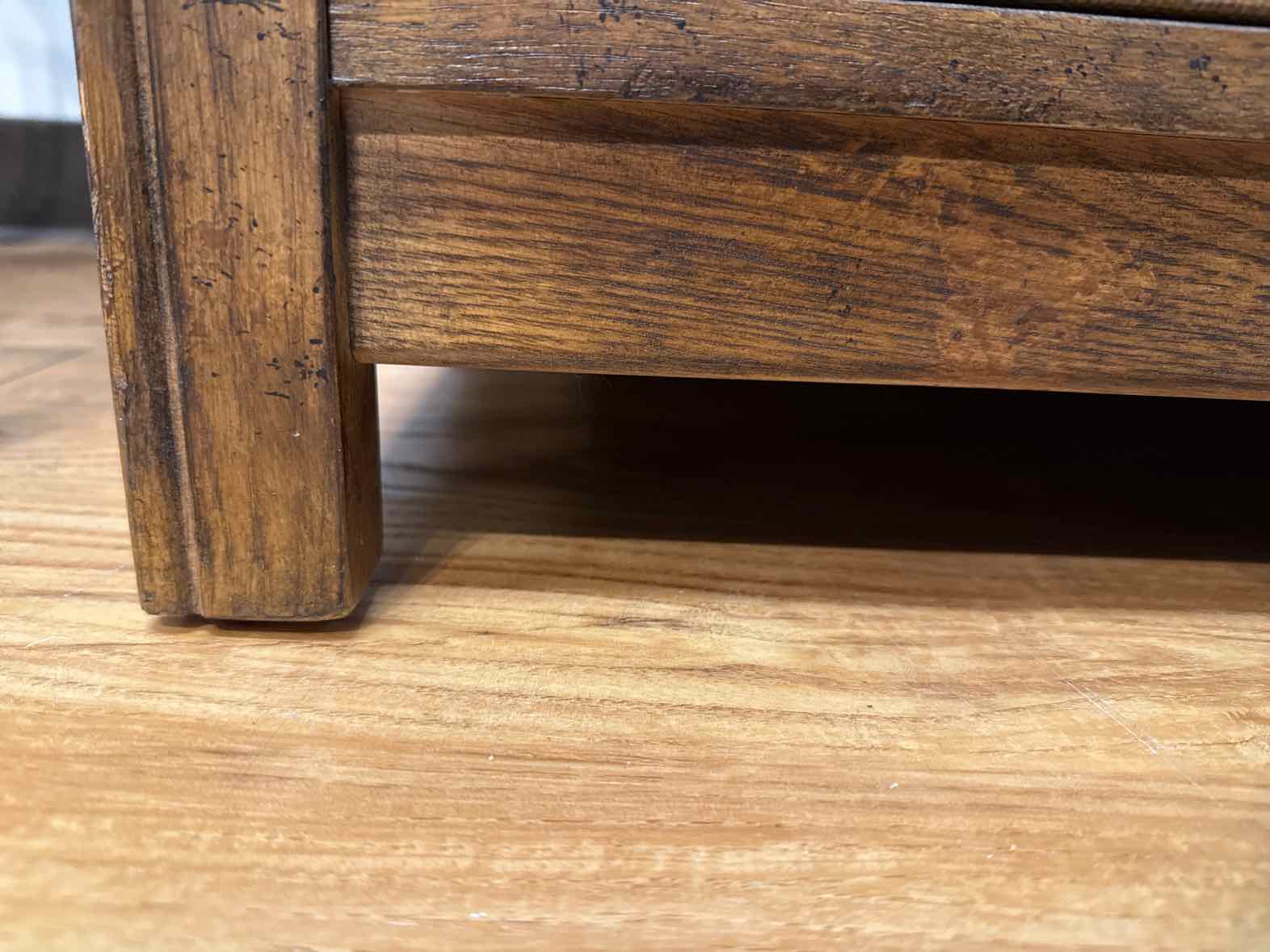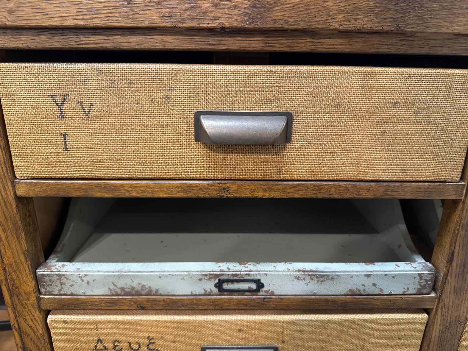 'Teague' apothecary-style console with 9 drawers and 6 trays, distressed finish and antique bronze hardware