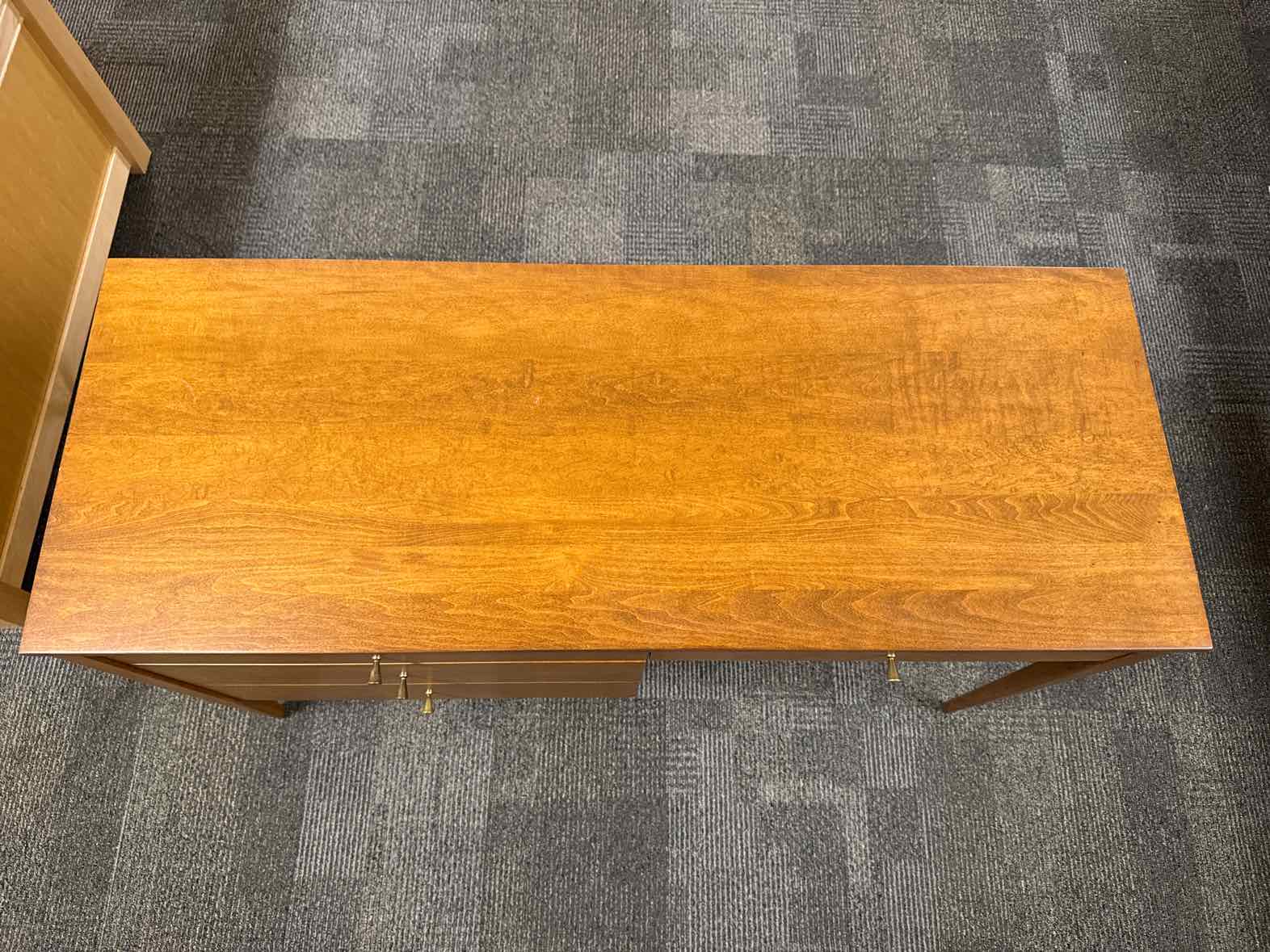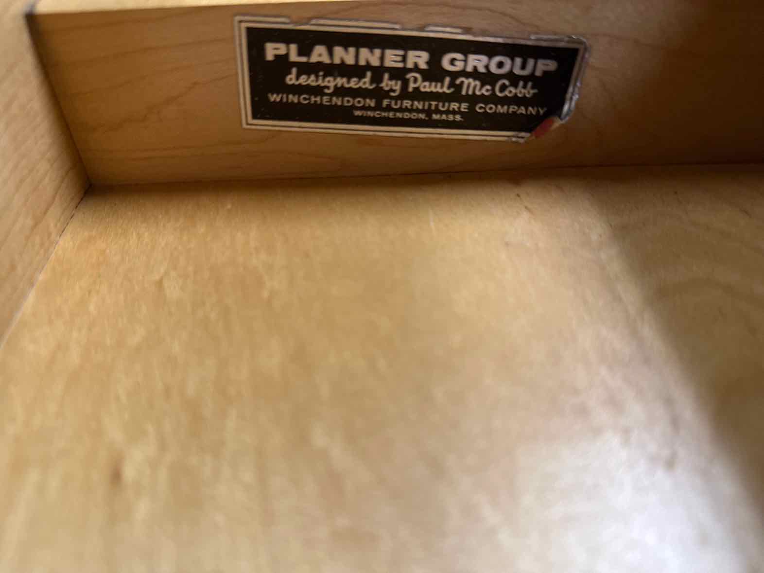 Planner Group MCM desk and chair by Paul McNabb with 4 drawers and brass pulls, curved spindle back chair
