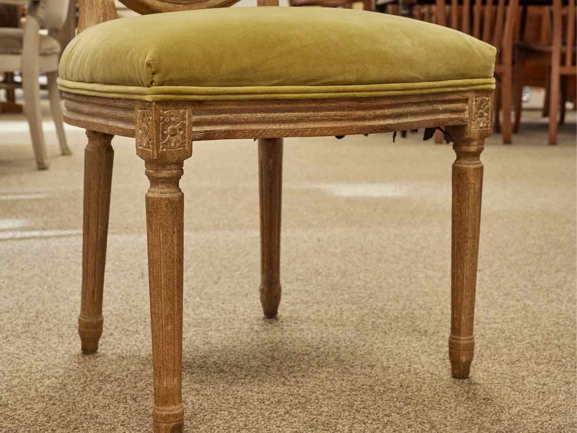 Set of 6 French style oval back dining chairs in avocado velvet on drifted wood frame