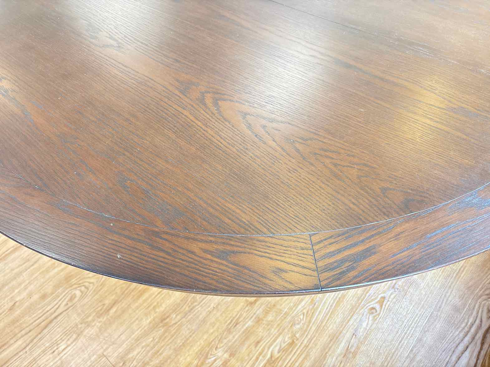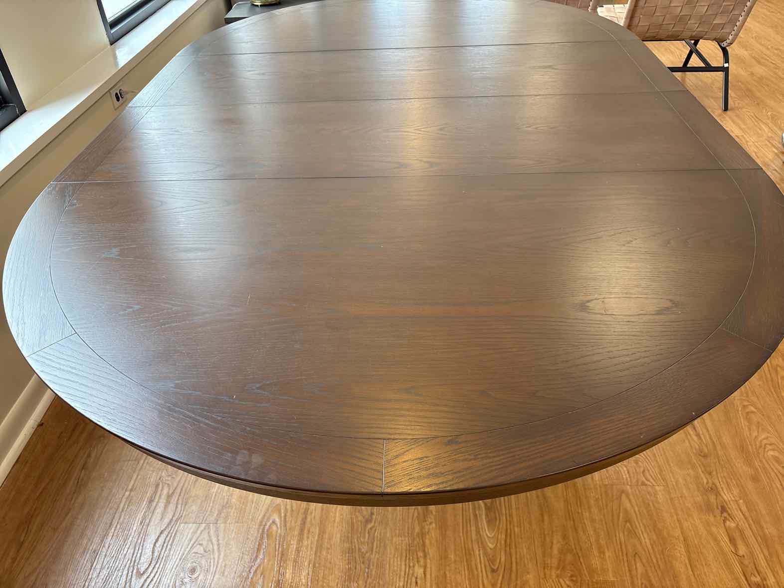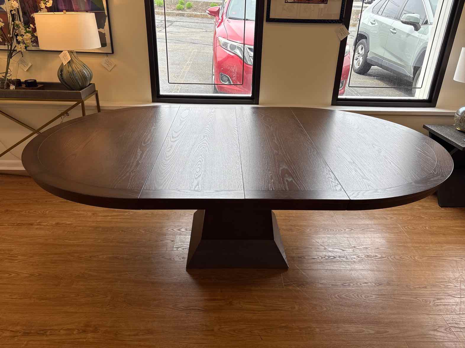 'Leighton' extension oval dining table in Mocha, table is 62"dia when closed, pedestal base and 2 17.5"w leaves