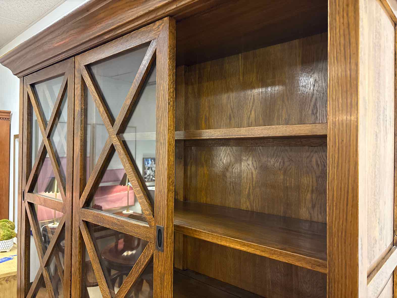 Oak china cabinet, sliding glass door front with x detailing & 3 shelves, 3 drawers & cabinet base w/ shelves