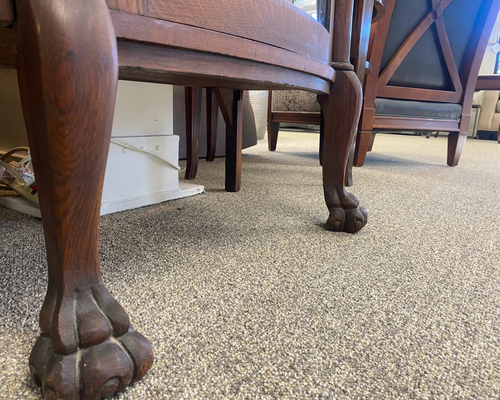 Vintage Oak Display Cabinet with 4 Wood shelves & Curved Glass & Claw Feet