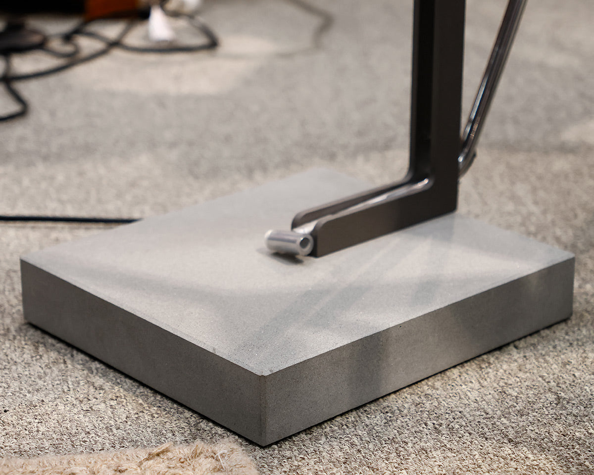 "Mama" Floor Lamp w/ counterbalanced control arm, chrome, dark grey shade, And light gray stone stand