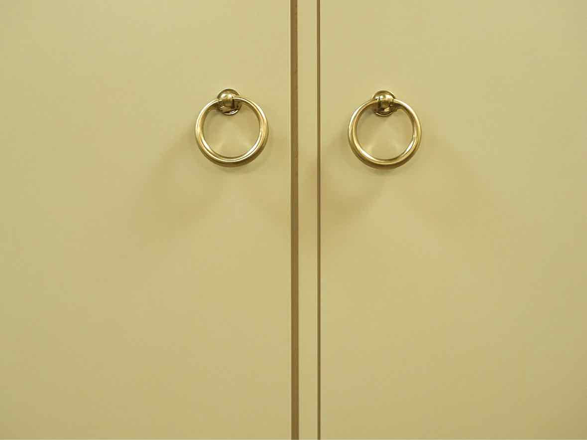 "Tomlin" door & drawer cabinet (82439) in maple with classic Santa Barbara painted finish and satin brass ring pulls