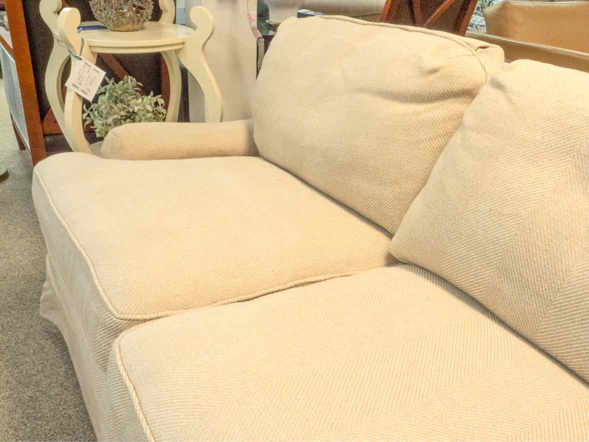 Custom Two Cushion English Roll Arm Loveseat in Beige Herringbone
