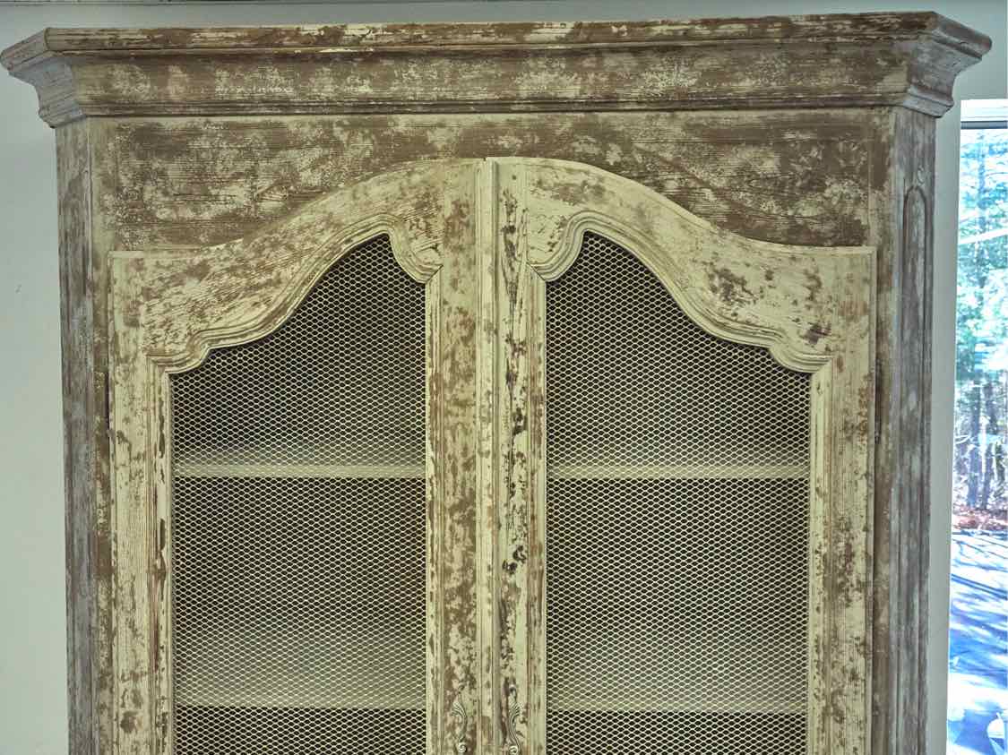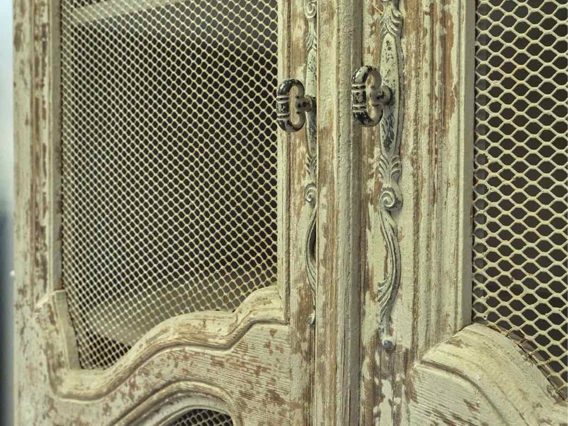 Rustic French-inspired display cabinet in grey finish with wire mesh doors