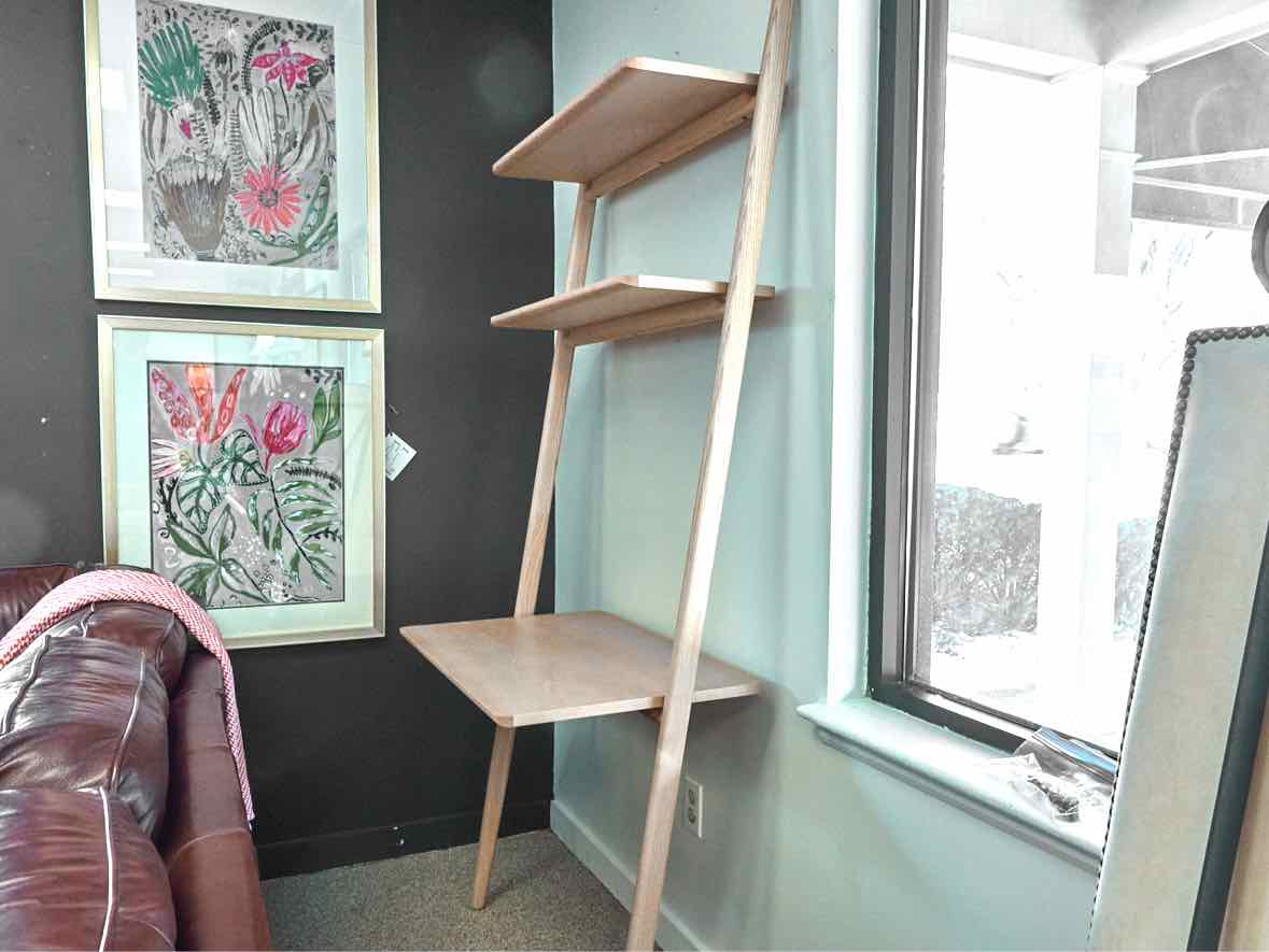 "Folk Ladder" leaning wall desk in natural ash with 2 upper shelves and optional wall mount hardware