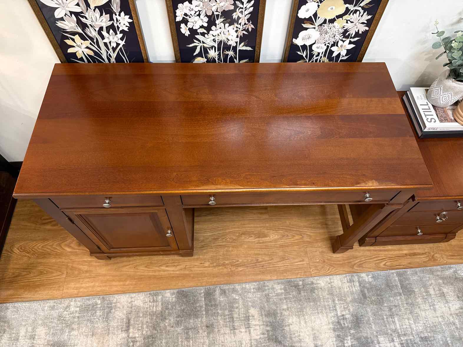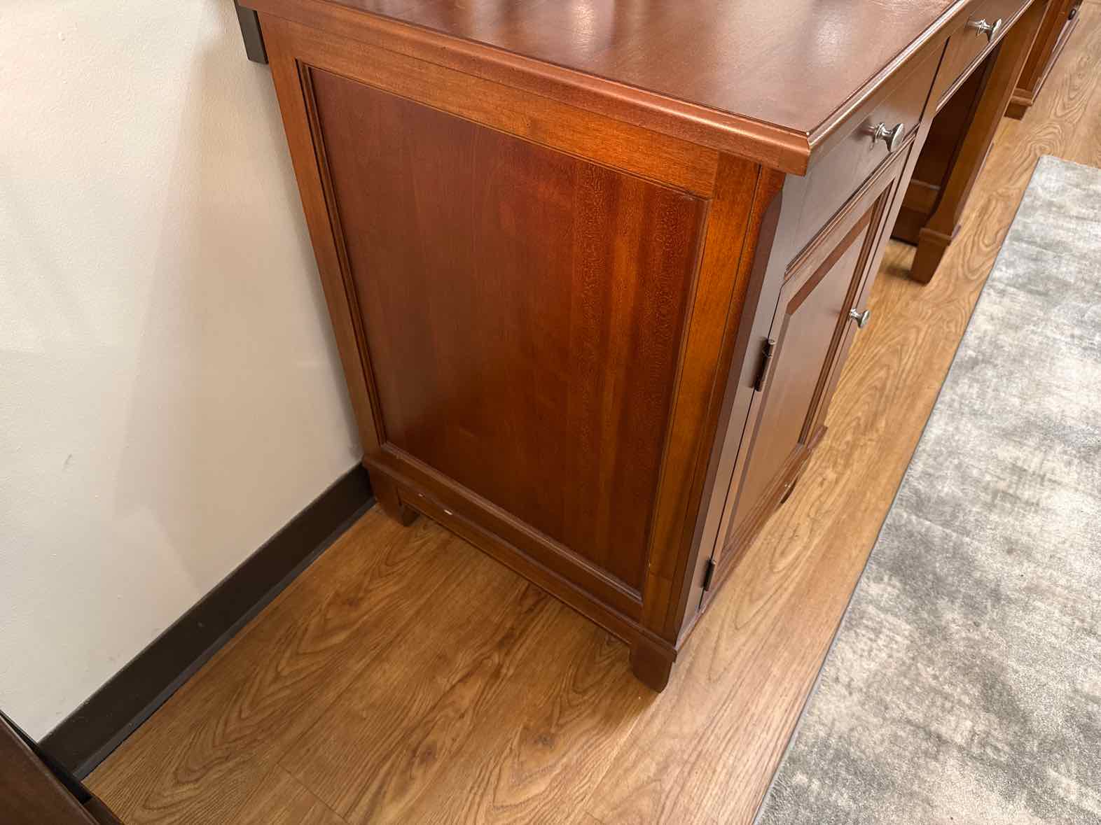 2-drawer cherry desk with keyboard tray, cabinet with adjustable shelf, nickel hardware (light wear on top edge)