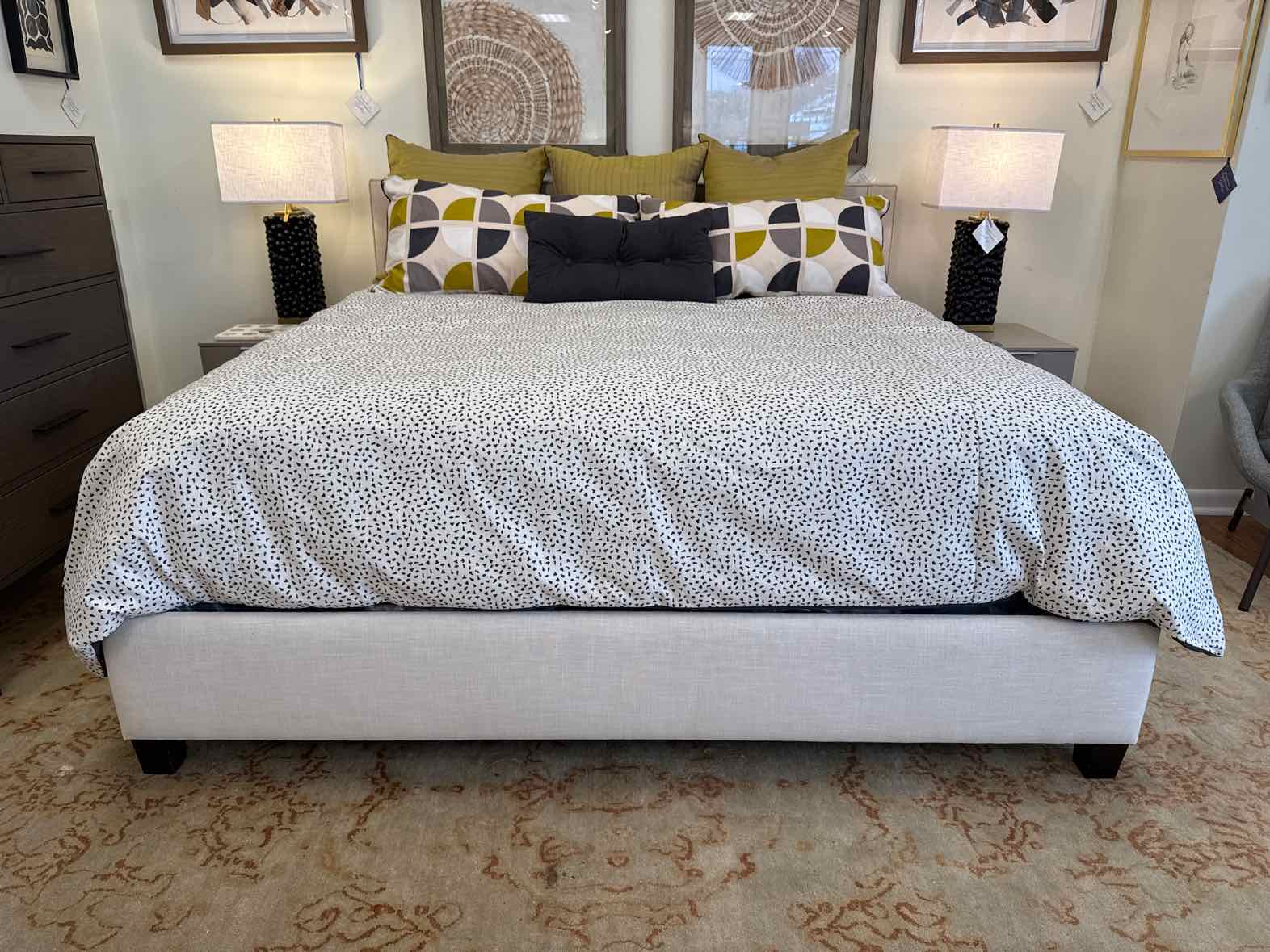 Upholstered king bed in taupe: headboard, footboard, sides, metal supports