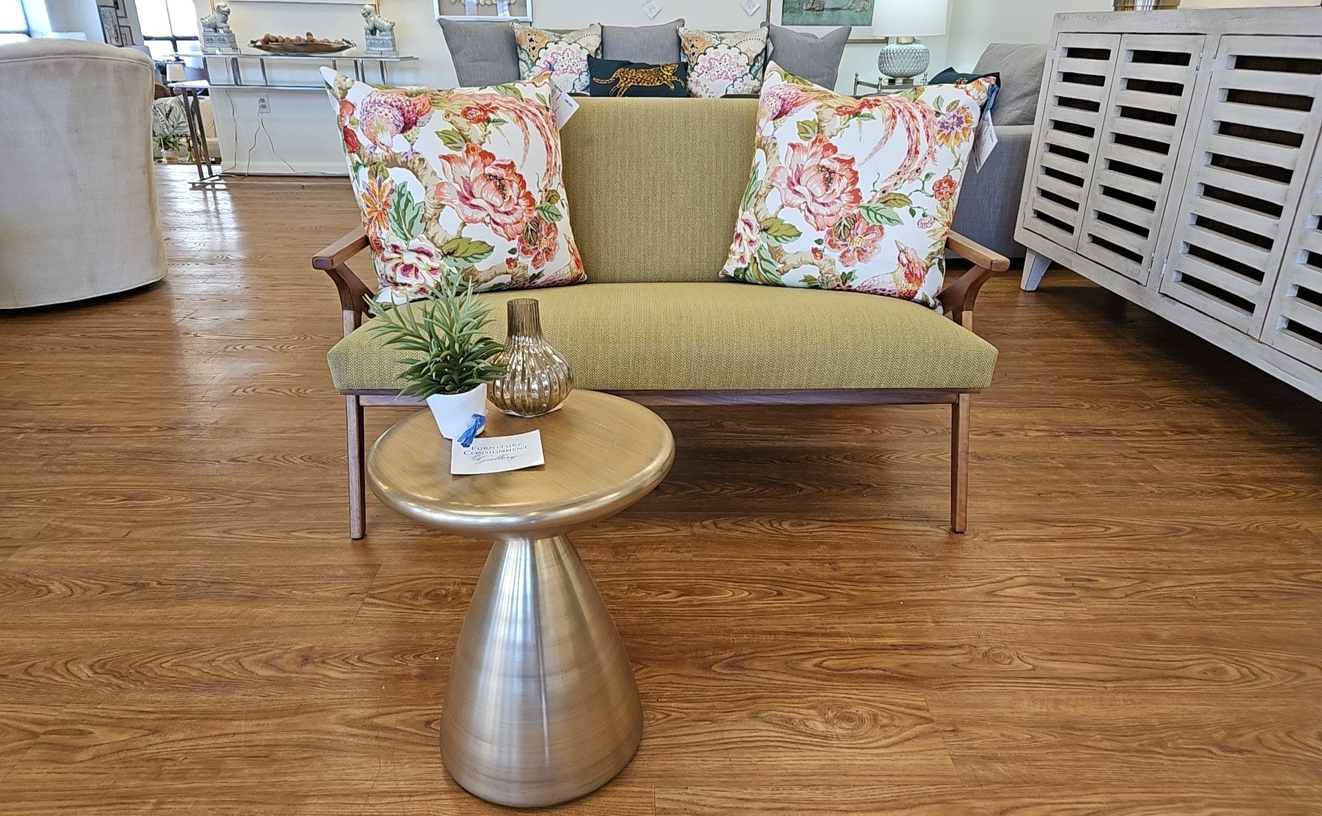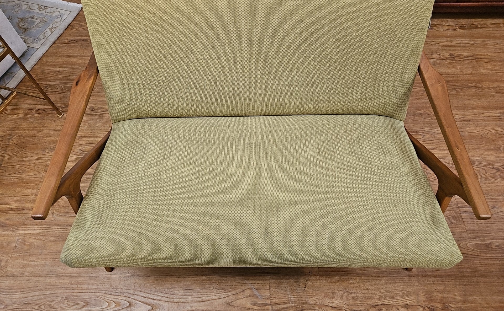 'Cavett' mid-century inspired wood framed loveseat, chartreuse tweed fabric and solid walnut frame