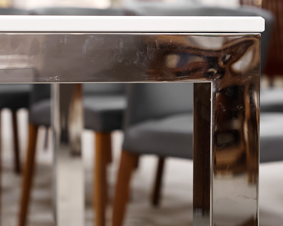 MGBW Chrome base dining table. White marble rectangular top.