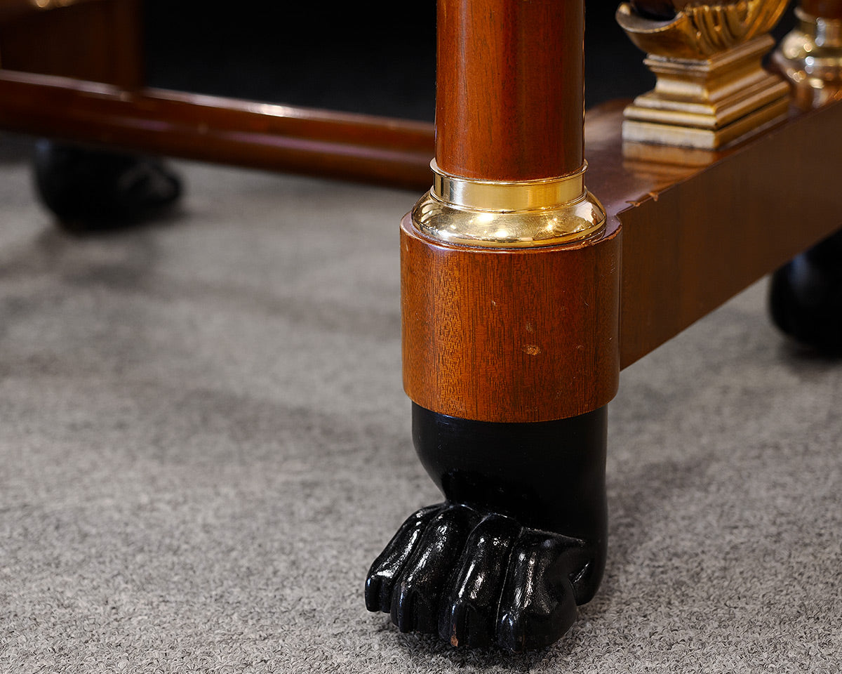 Pair of empire Lannuier nightstands w/ one drawer, brass harps on the sides, and lions paws