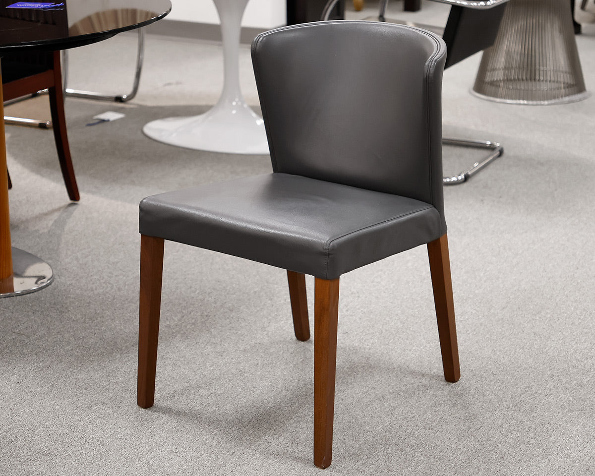 Set of 8 leather dining chairs. Dark gray leather low-back side chairs on tapered legs.