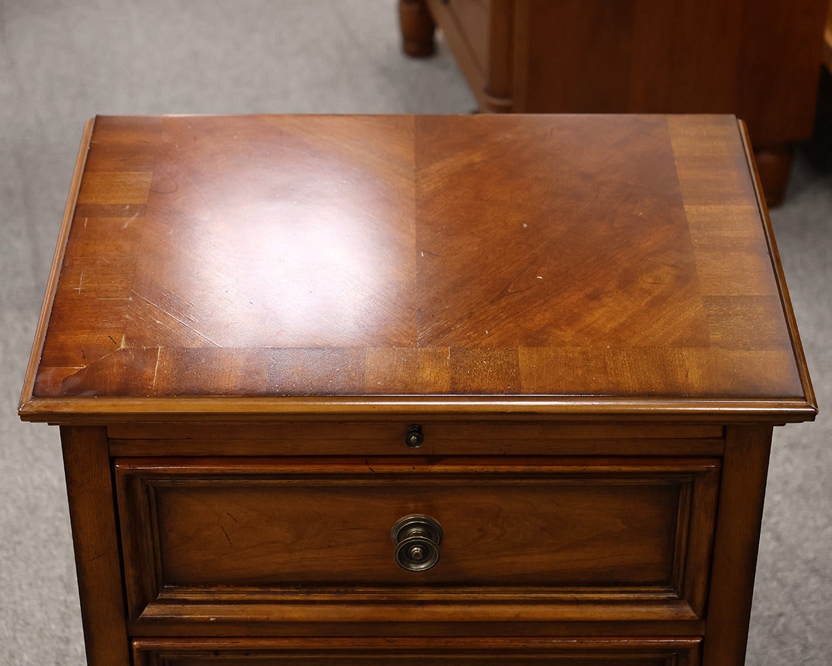 Basssett night stand in a mahogany wood. Two drawers with a pull out shelf. Round bronze hardware.