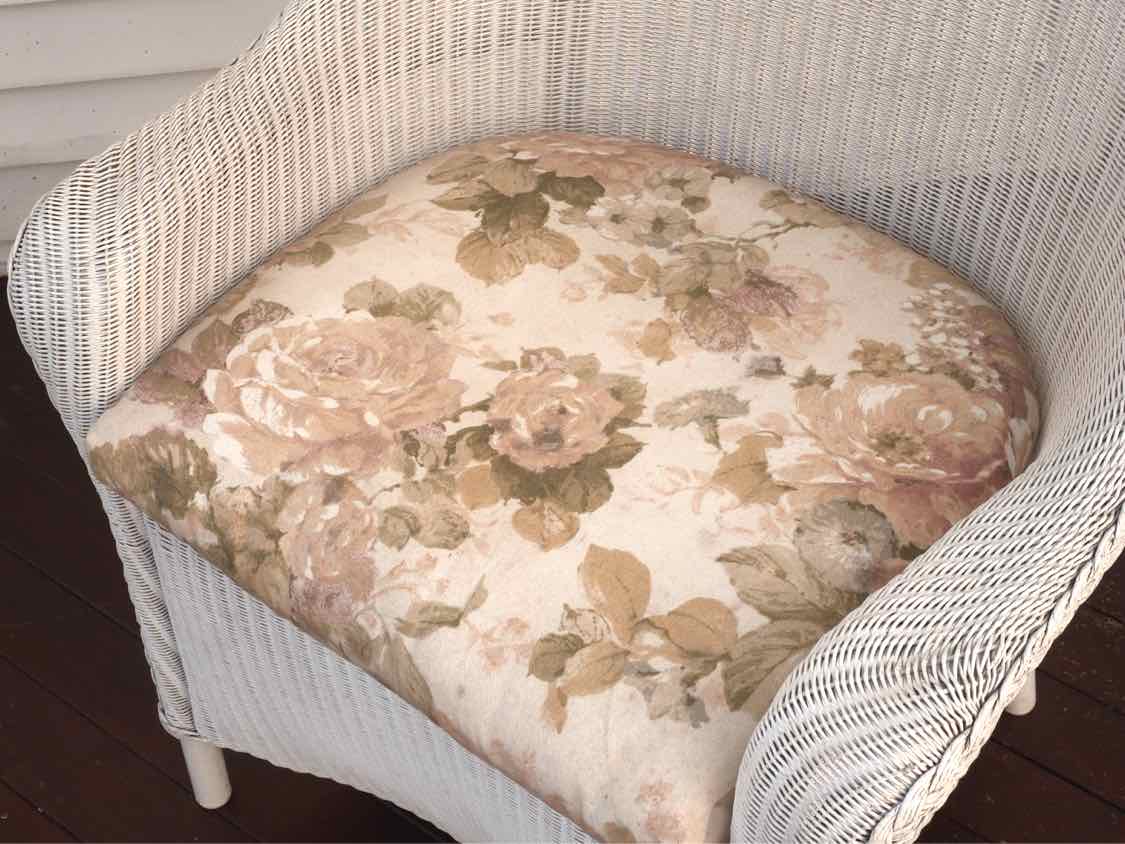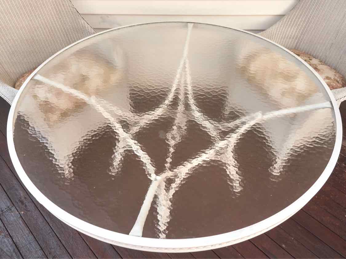 Lloyd Flanders Outdoor Glass Top Table & (4) Wicker Chairs With Cushions