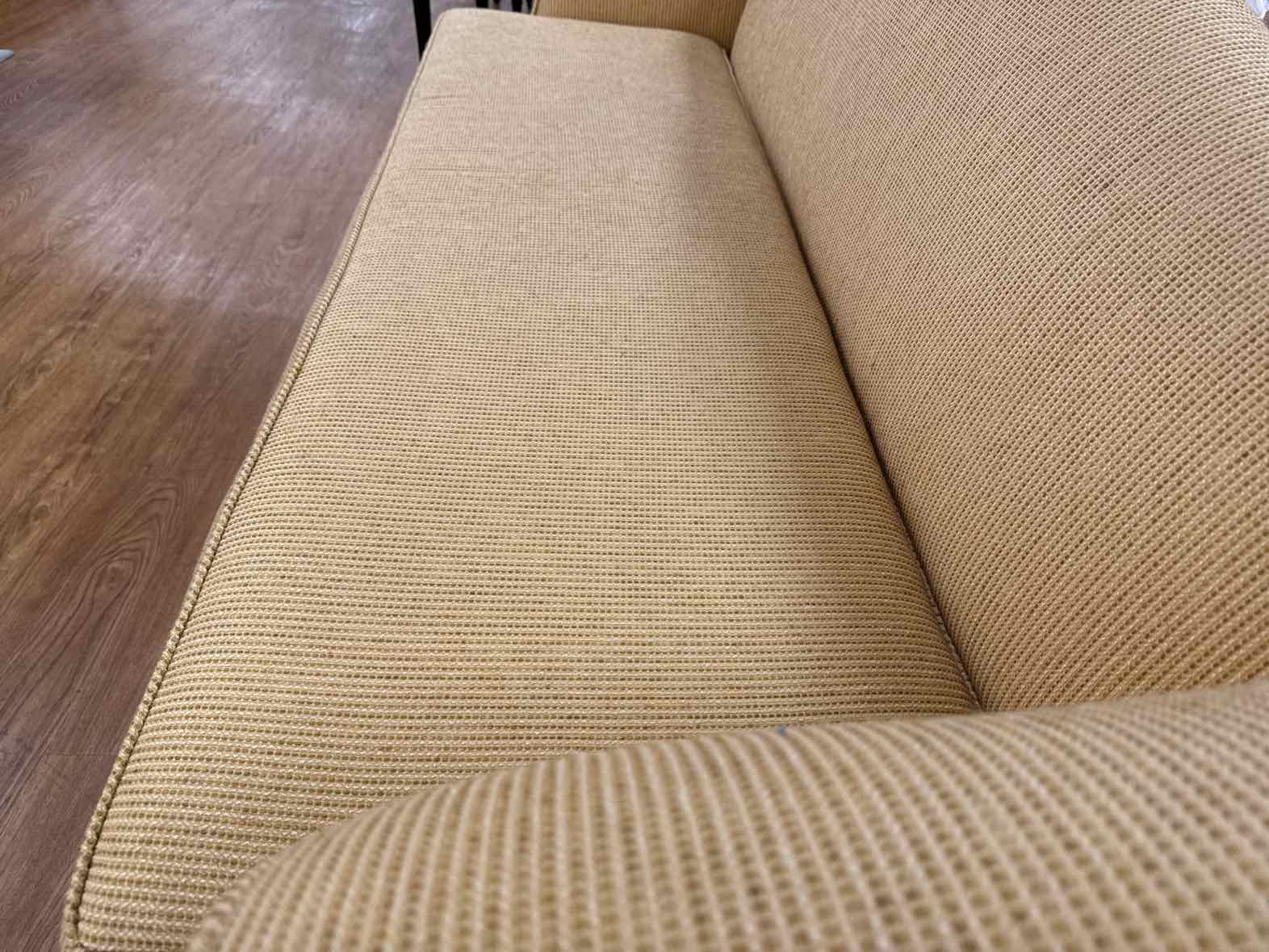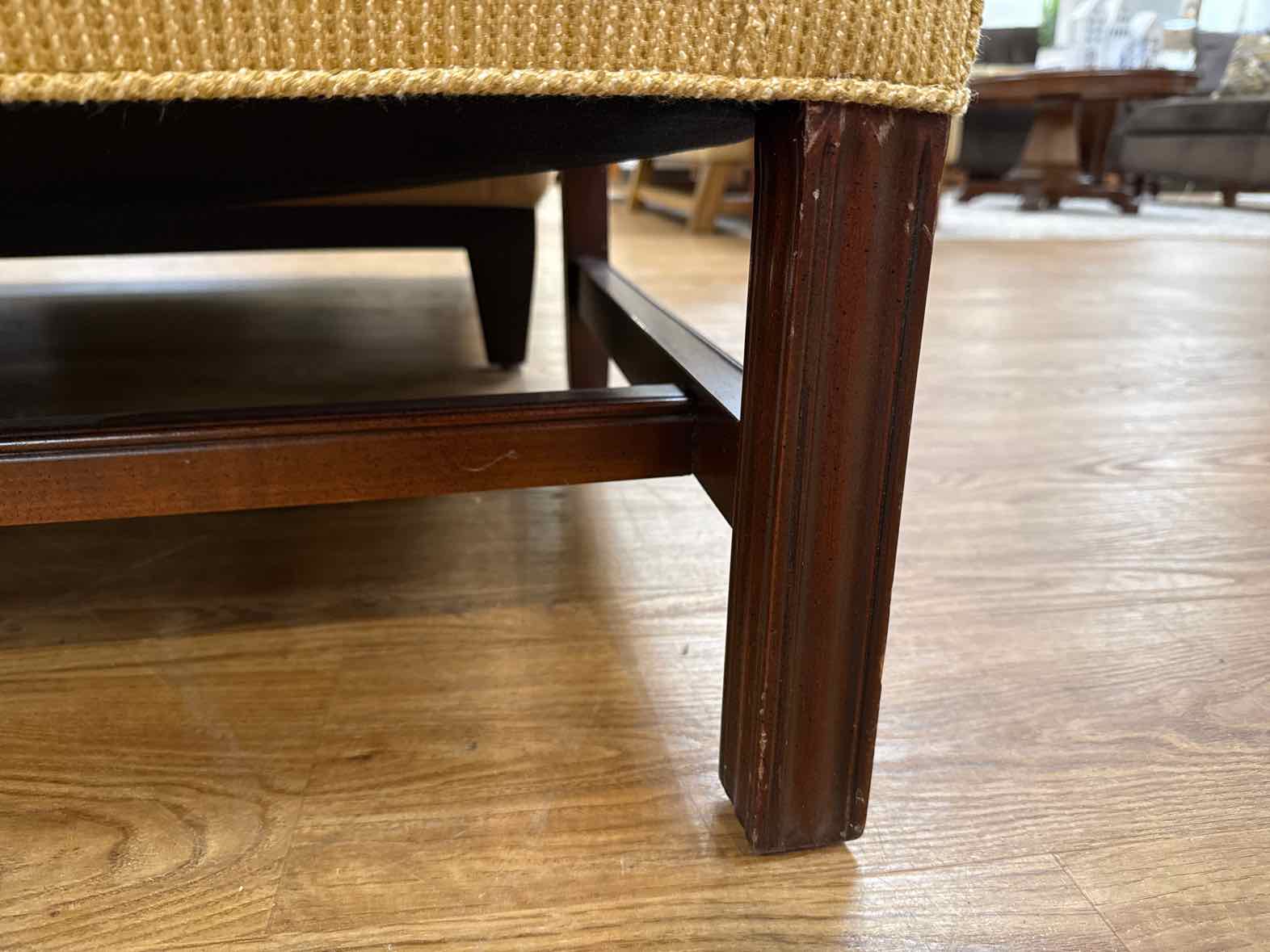 Bench seat rolled arm chippendale camelback sofa in butter yellow w/ dark wooden frame