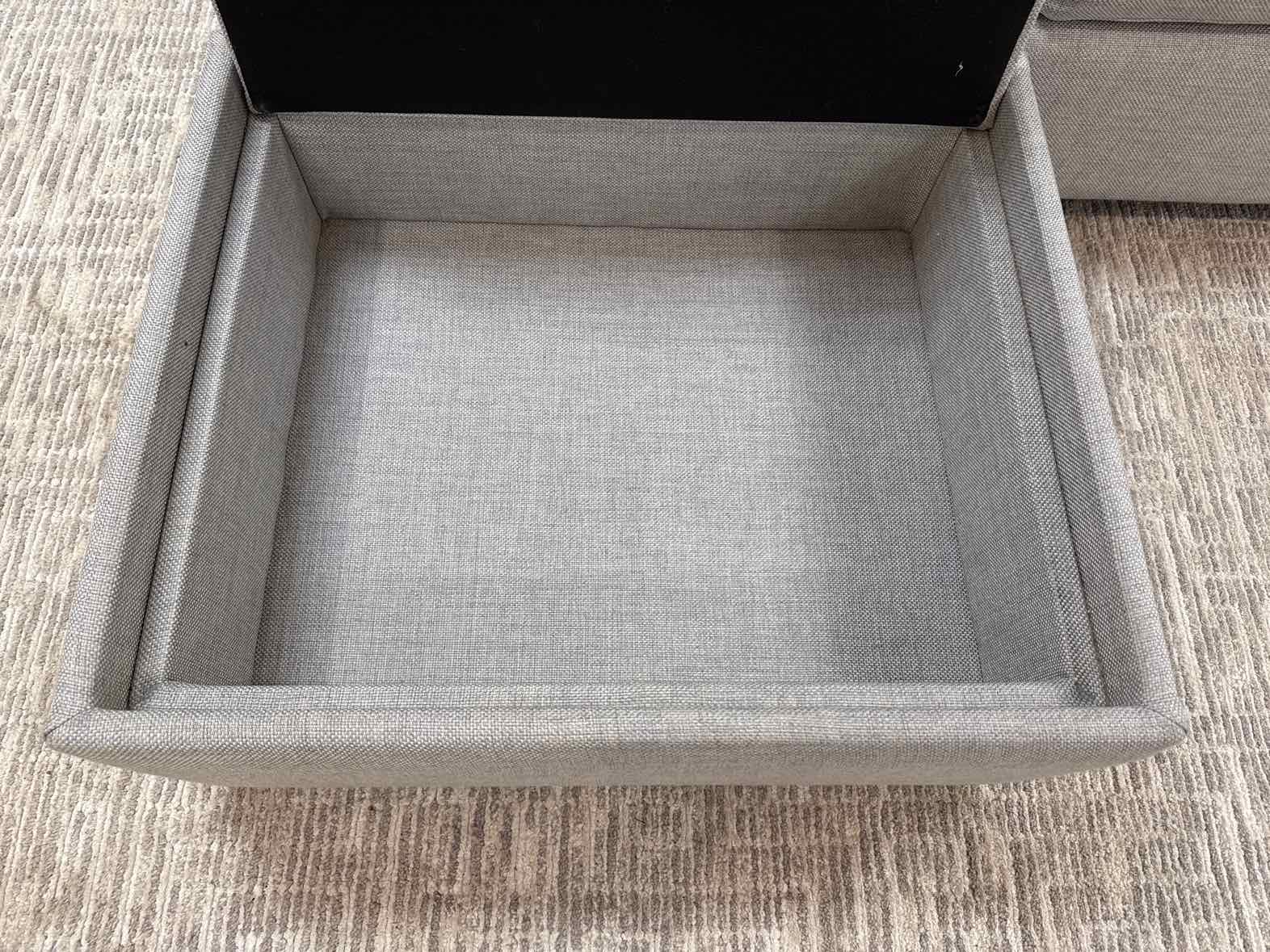 'Barrett II' sofa in light grey with reversible chaise and storage ottoman, track arm and black feet