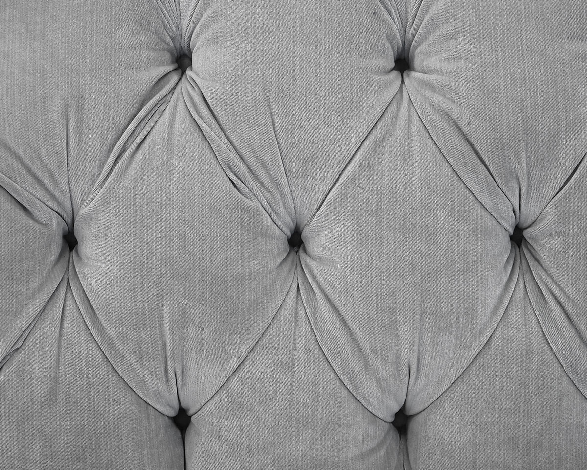 "Chadwick" tufted roll-arm roll-back sofa in pale grey velvet on bun feet