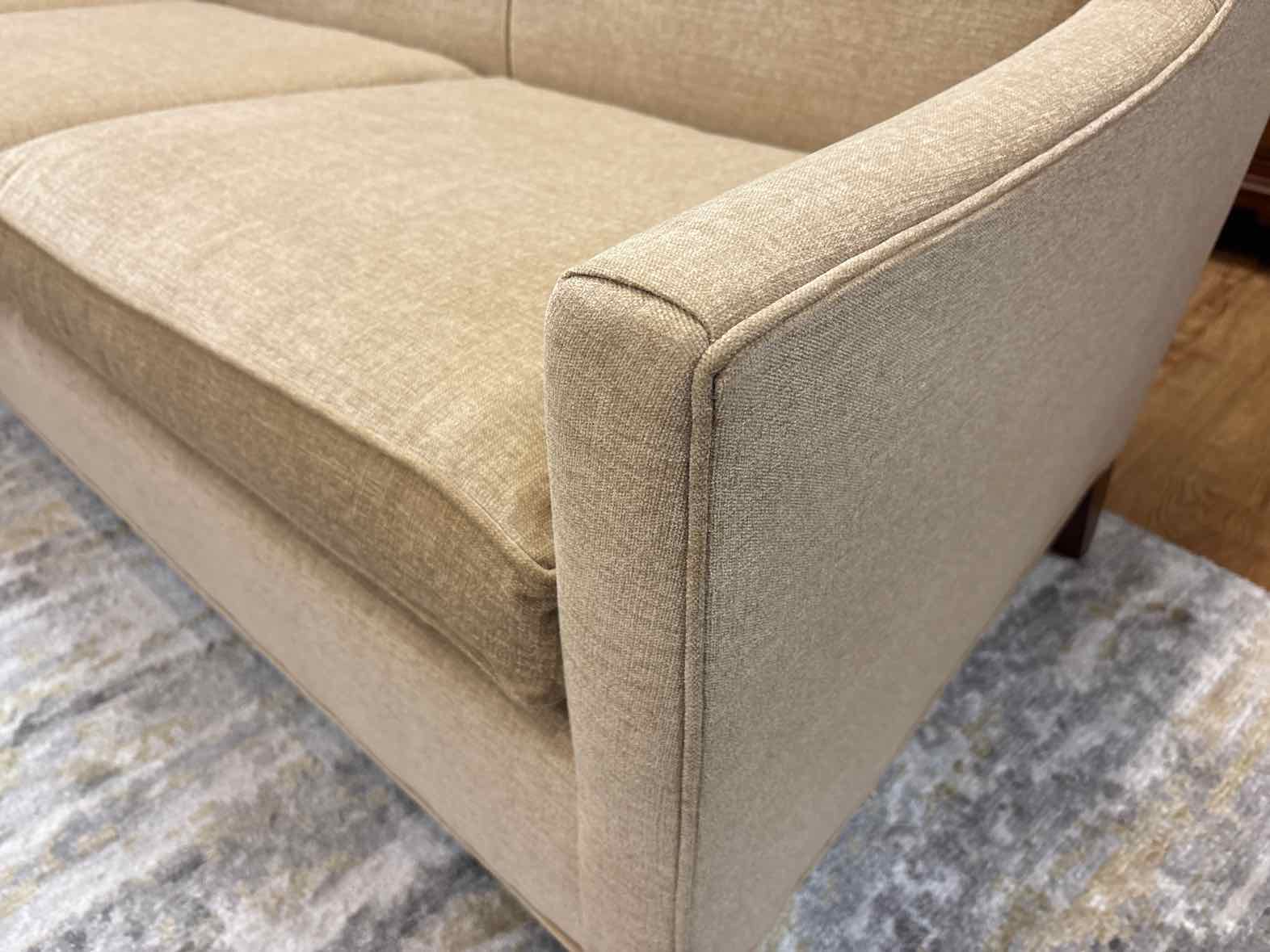 'Cara' 3-seat tight back sofa in soft gold performance chenille, gently sloped arm and espresso foot