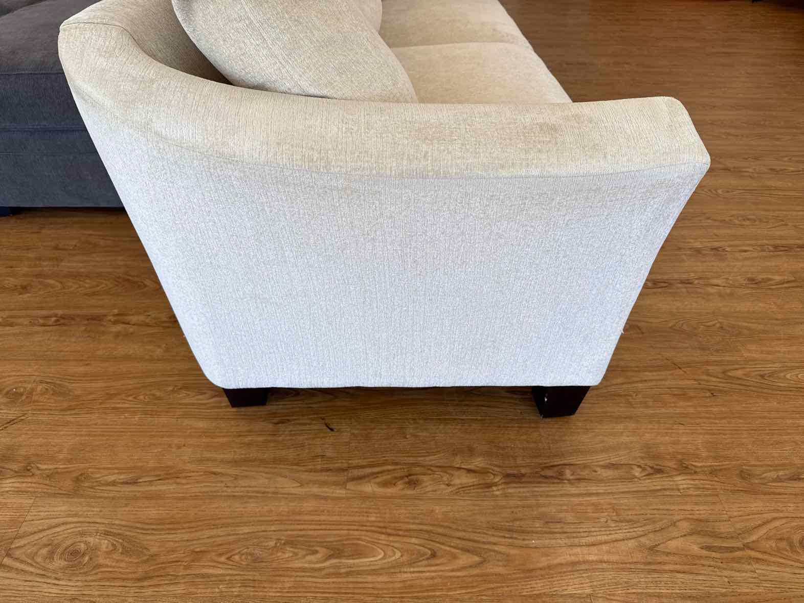 2-seat buttercream chenille curved sofa with espresso feet and flared arm