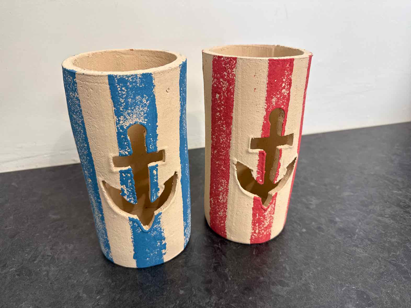 Pair of Red & Blue Striped Clay Anchor Luminaries