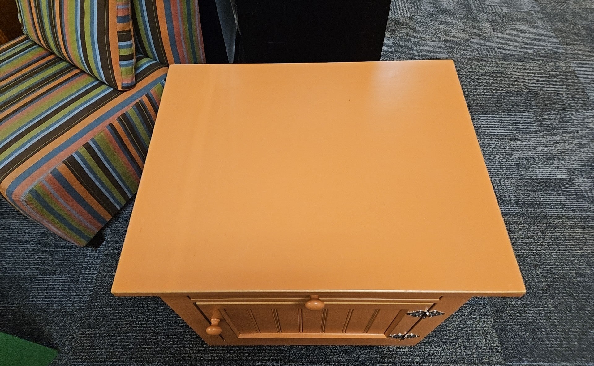 Soft orange side table with single drawer and lower cabinet, beadboard accents