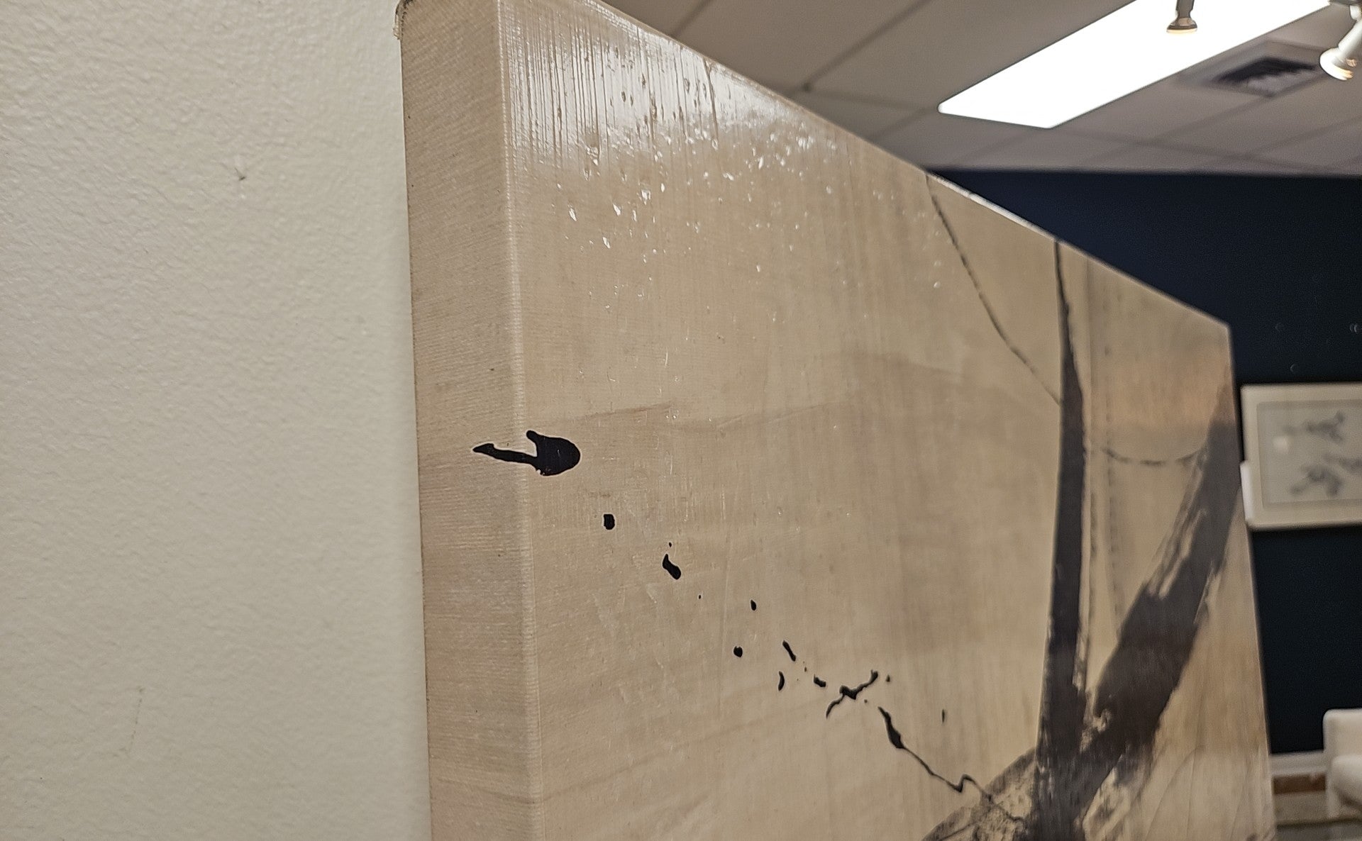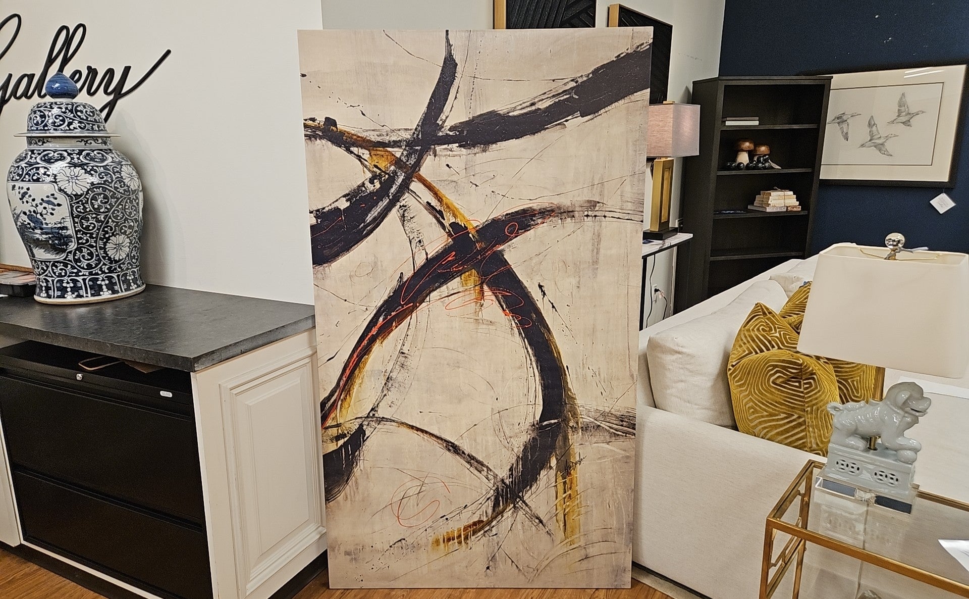 Abstact print with taupe background and black, sepia, and orange swirls - textured clear glaze coat