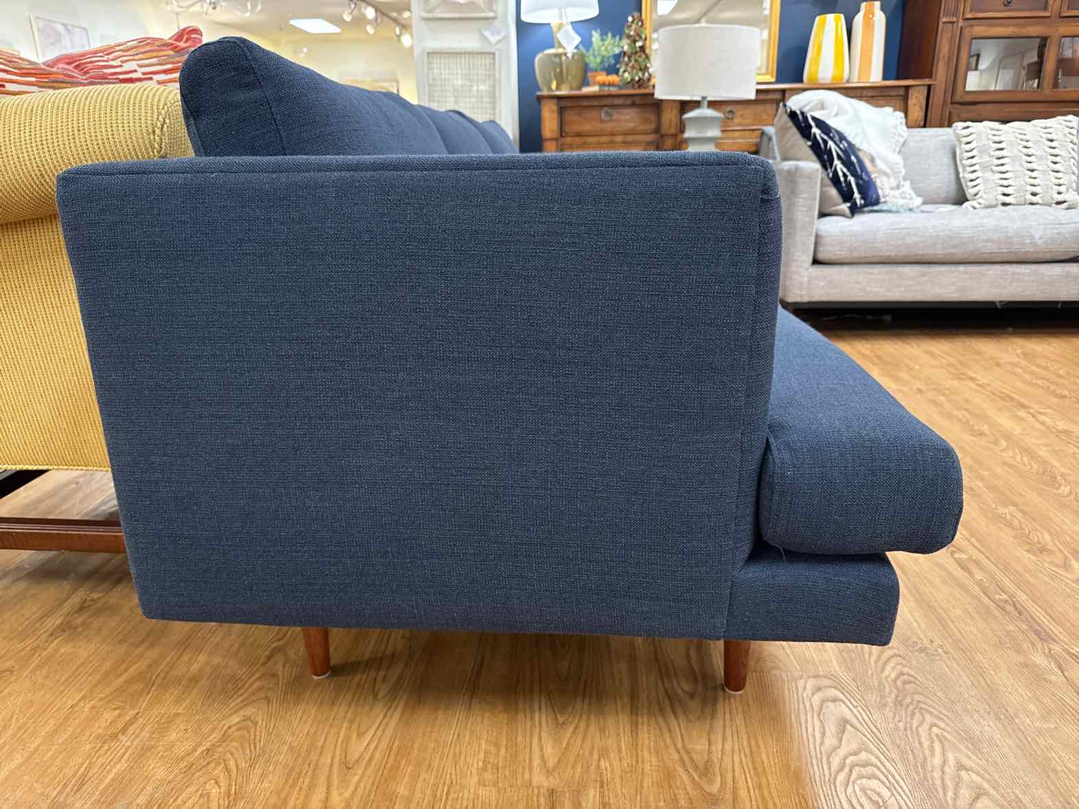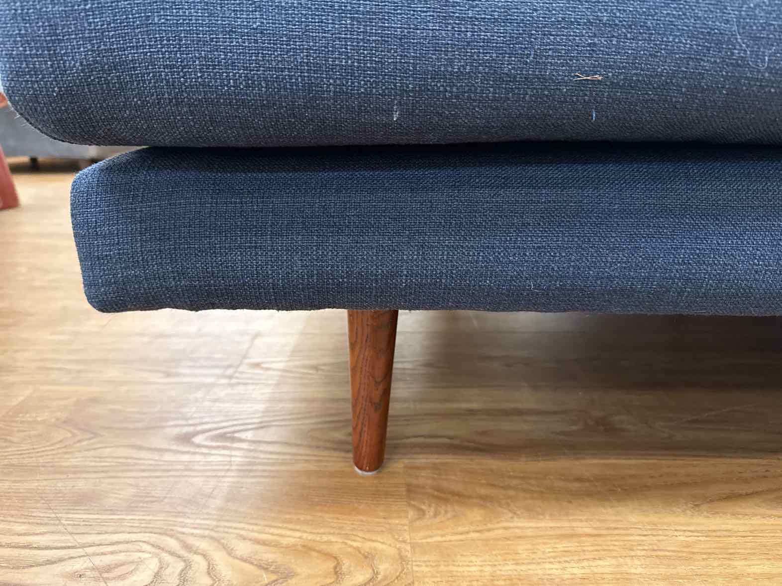'Miller' upholstered three seat sofa in blue basketweave fabric w/ recessed arms and walnut tapered legs
