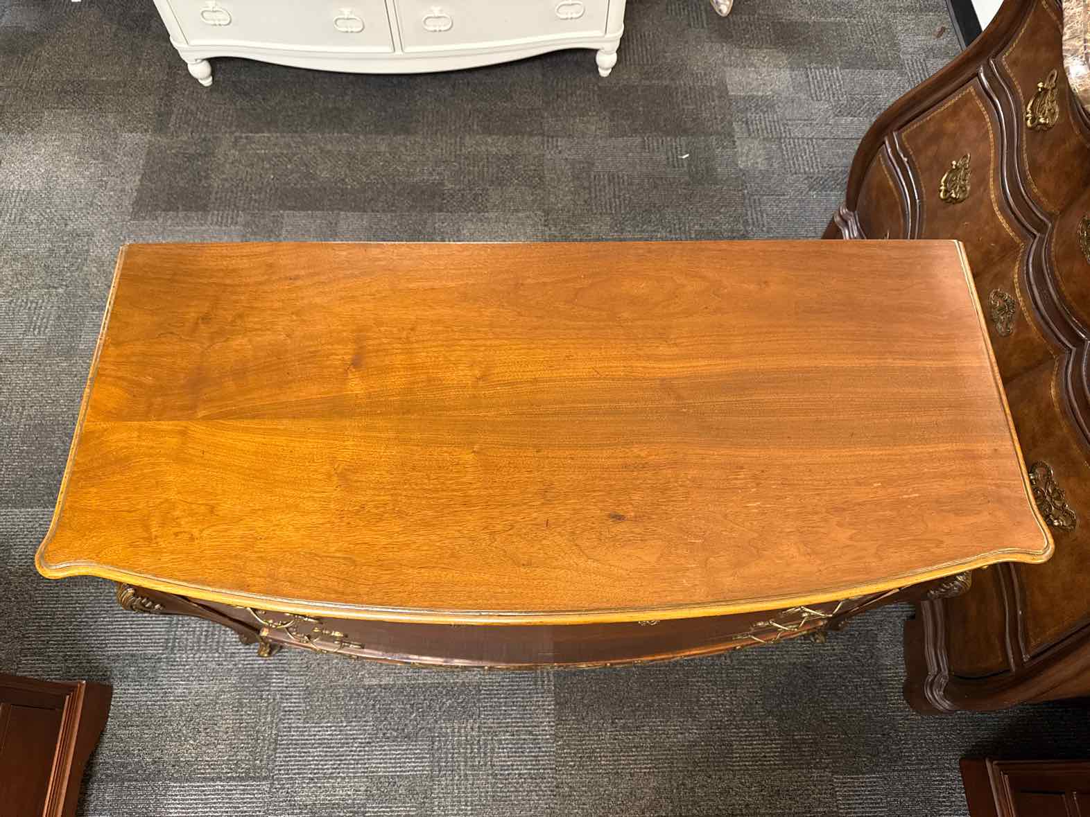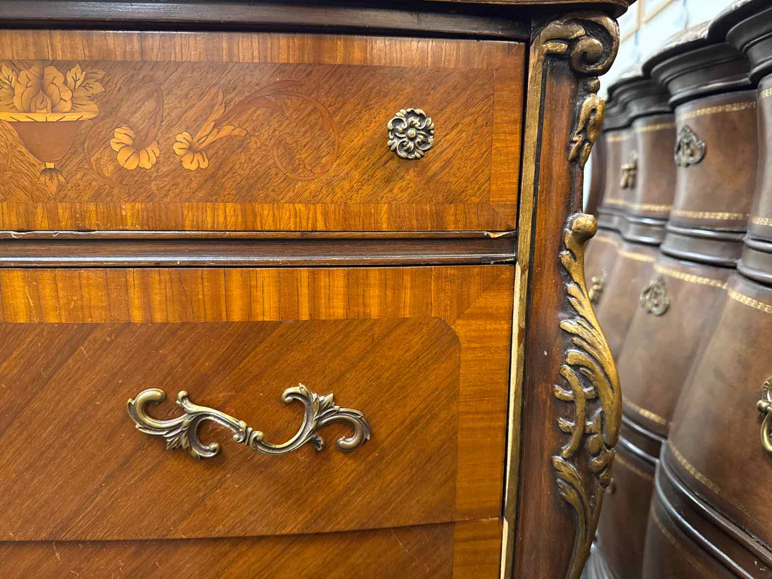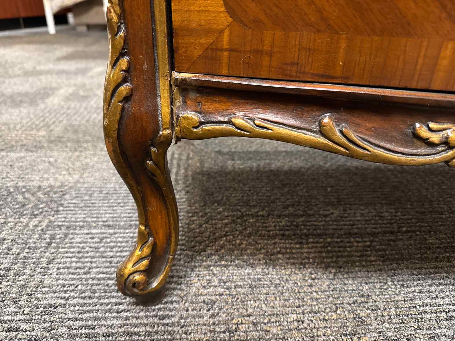 Antique 5-drawer French provincial inlaid dresser, bow front, decorative brass pulls, painted gold accents